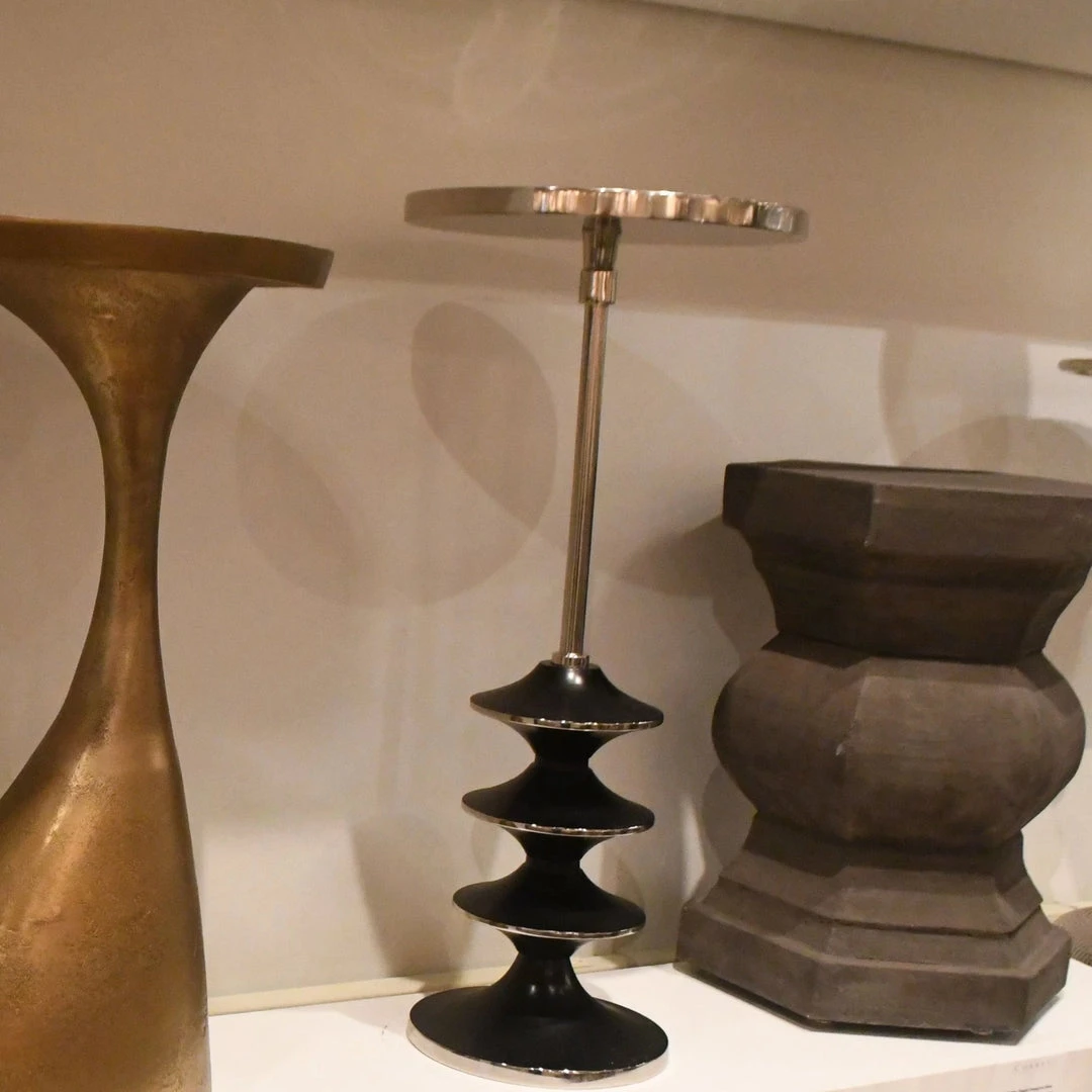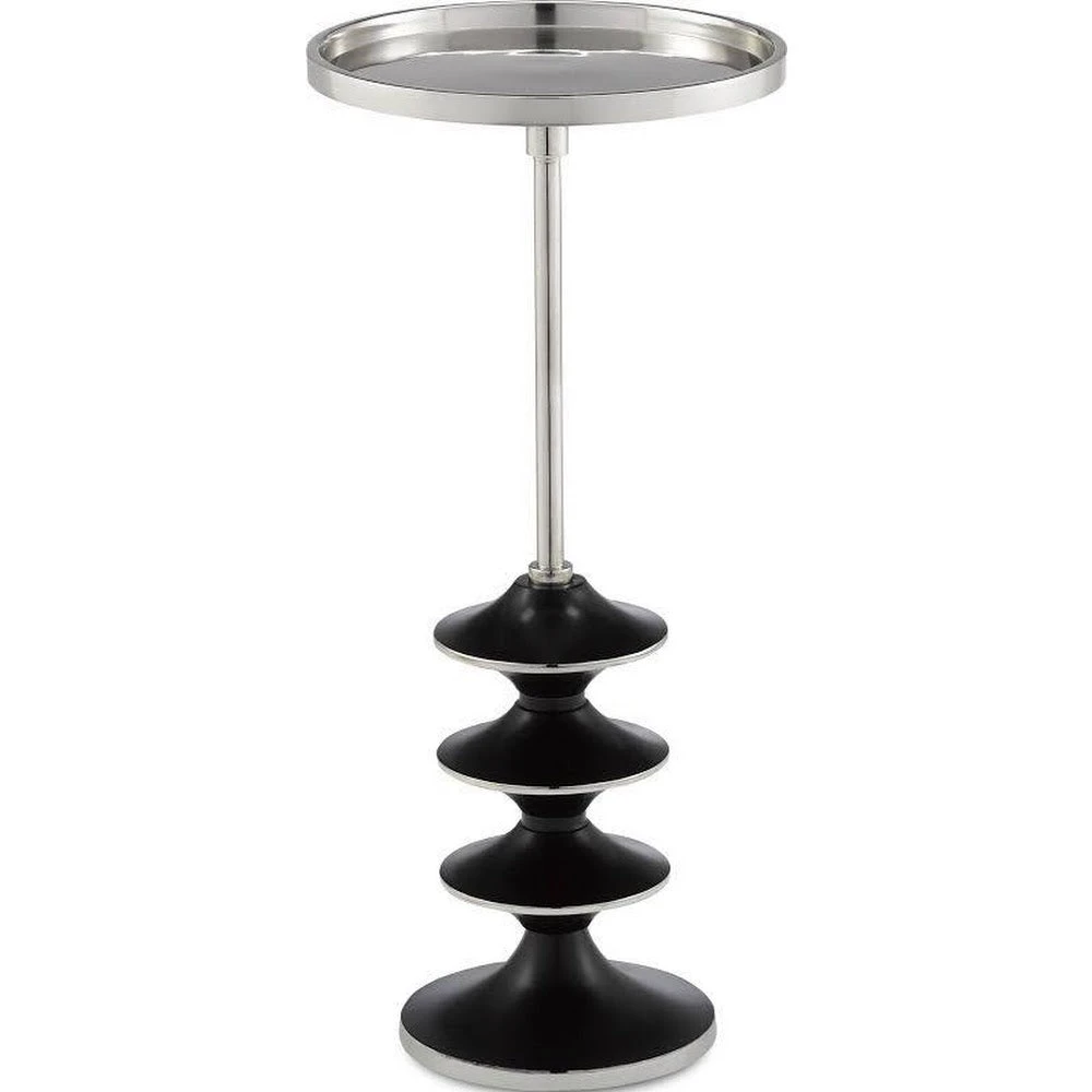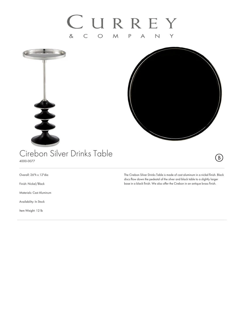 The Cirebon Silver Drinks Table from Currey and Company is made of cast aluminum that has been treated to a shiny nickel finish. An industrial chic piece, it is accentuated with black discs that flow down the pedestal to a slightly larger base. Capturing a masculine flair, the Cirebon blends well with mid century modern design to contemporary.Â