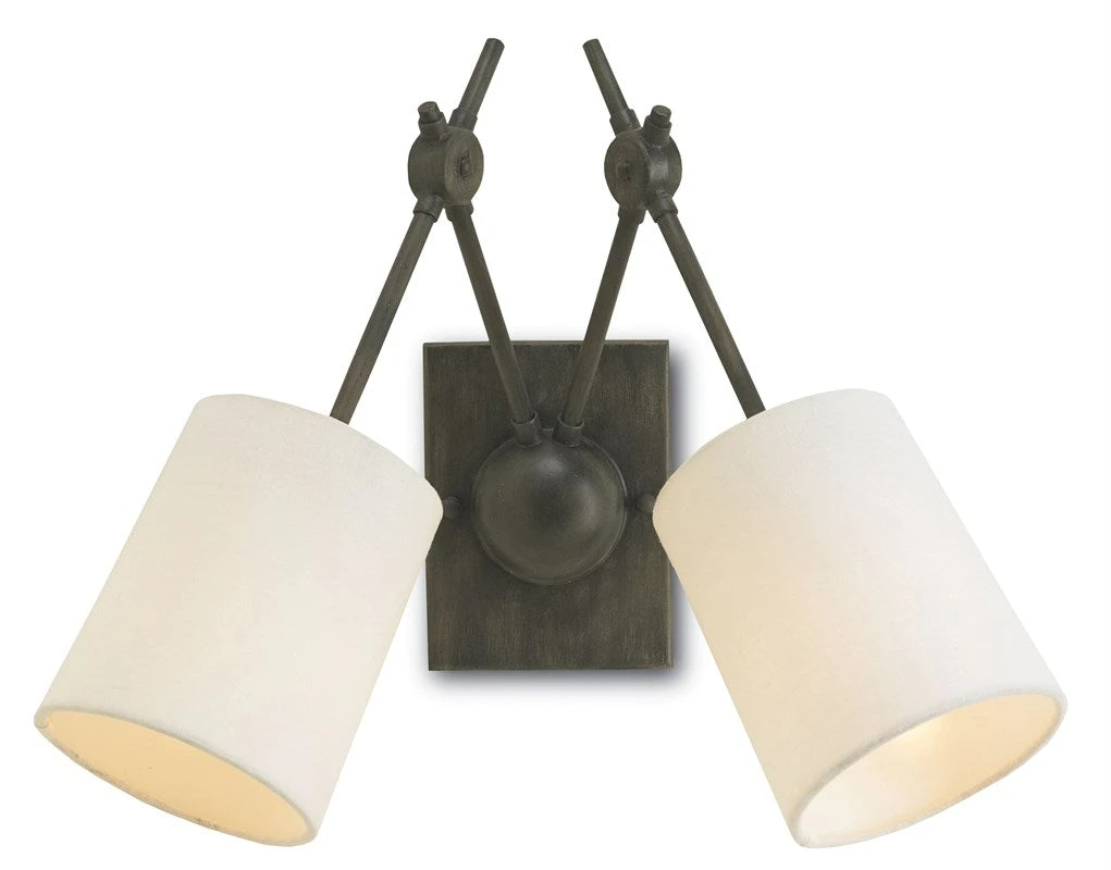 The angular arms and black iron finish on the Compass Wall Sconce from Currey and Company hold references popular during the Industrial Age. The rings that connect the arms on this black sconce have a machined feel to them, appearing as if they could raise the two white linen shades that angle away from each other.