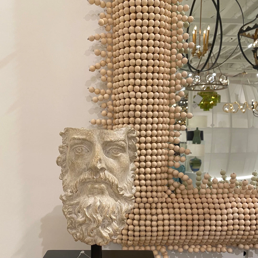 Textural playfulness results when strung Buri beads are fastened to the frame of the Jeanie Large Mirror in Beige from Currey and Company. The ends of strands extend beyond the edge of the decorative mirror, giving the Jeanie a very textural and high-end look.