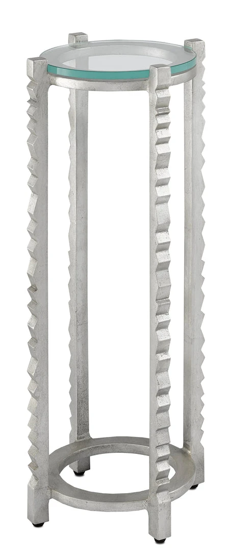 The Logan Silver Drinks Table from Currey and Company was inspired by Tom Caldwell’s Chase Silver Pendants collection. The toothy edges of the cast aluminum frame are finished in silver and topped with a thick glass plate.Â
