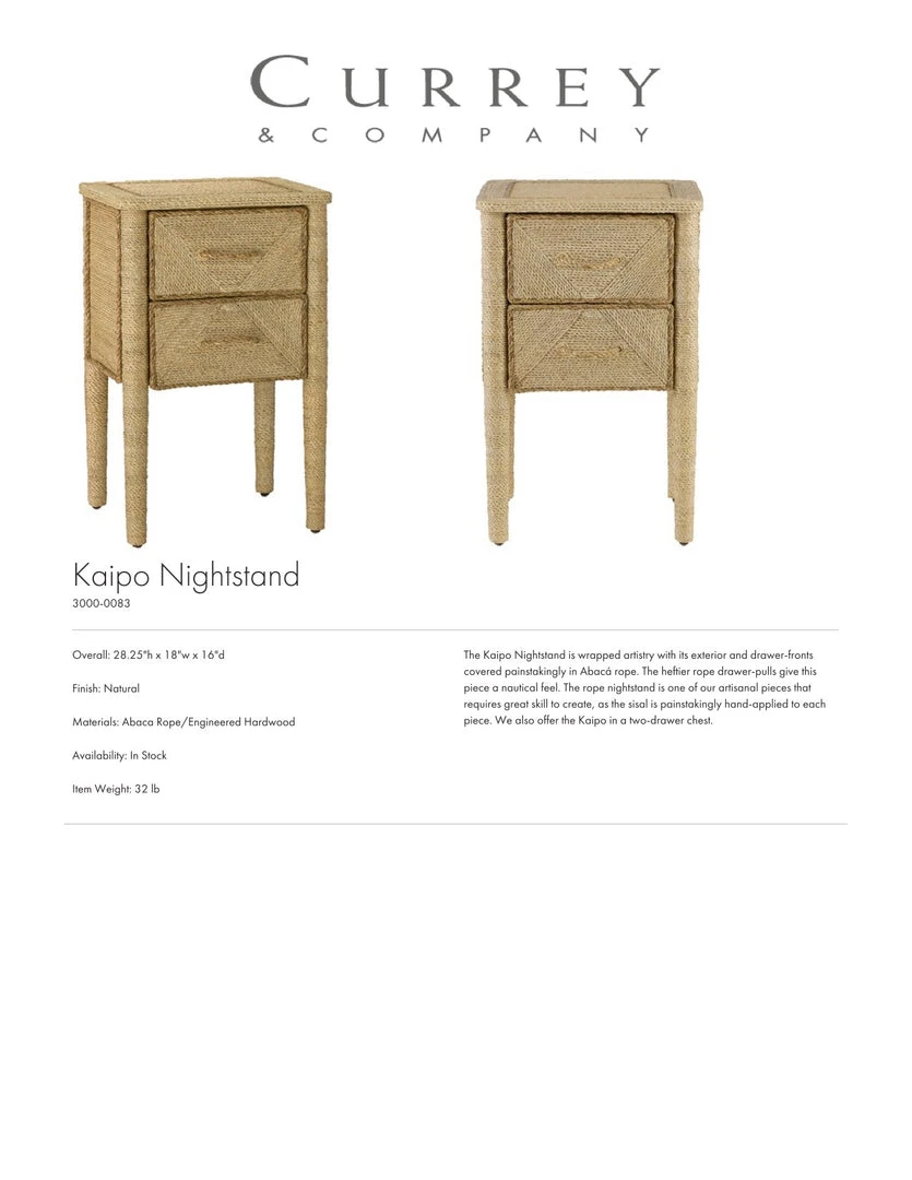 Enjoy the Kaipo Nightstands from Currey and Company in the bedroom for maximum beach style. The abaca rope wrapped furniture is hand applied with careful attention. Place a pair of these nightstands in your room and store all of your important essentials.