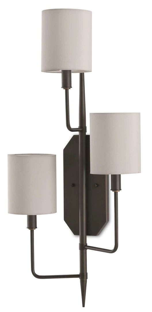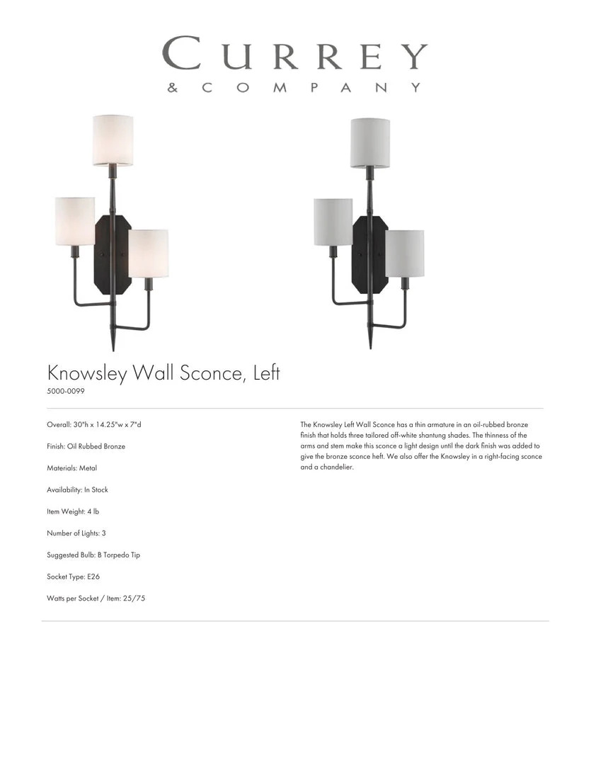 The Knowsley Wall Sconce from Currey and Company showcases restrained design and a noble personality. The Knowsley is designed with a straight stem and three tailored off white shantung shades and finished with an oil rubbed bronze finish. This versatile sconce is equally at home in a handsome den as it is in an elegant boudoir. For flanking headboards or fireplaces, we offer a right and a left sconce in the Knowsley.