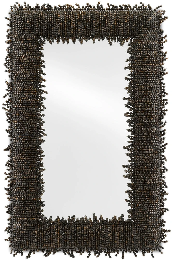 Textural playfulness results when strung Buri beads are fastened to the frame of the Pasay Large Mirror in Black from Currey and Company. The ends of strands extend beyond the edge of the dark brown decorative mirror, giving the Pasay a very textural and high-end look.