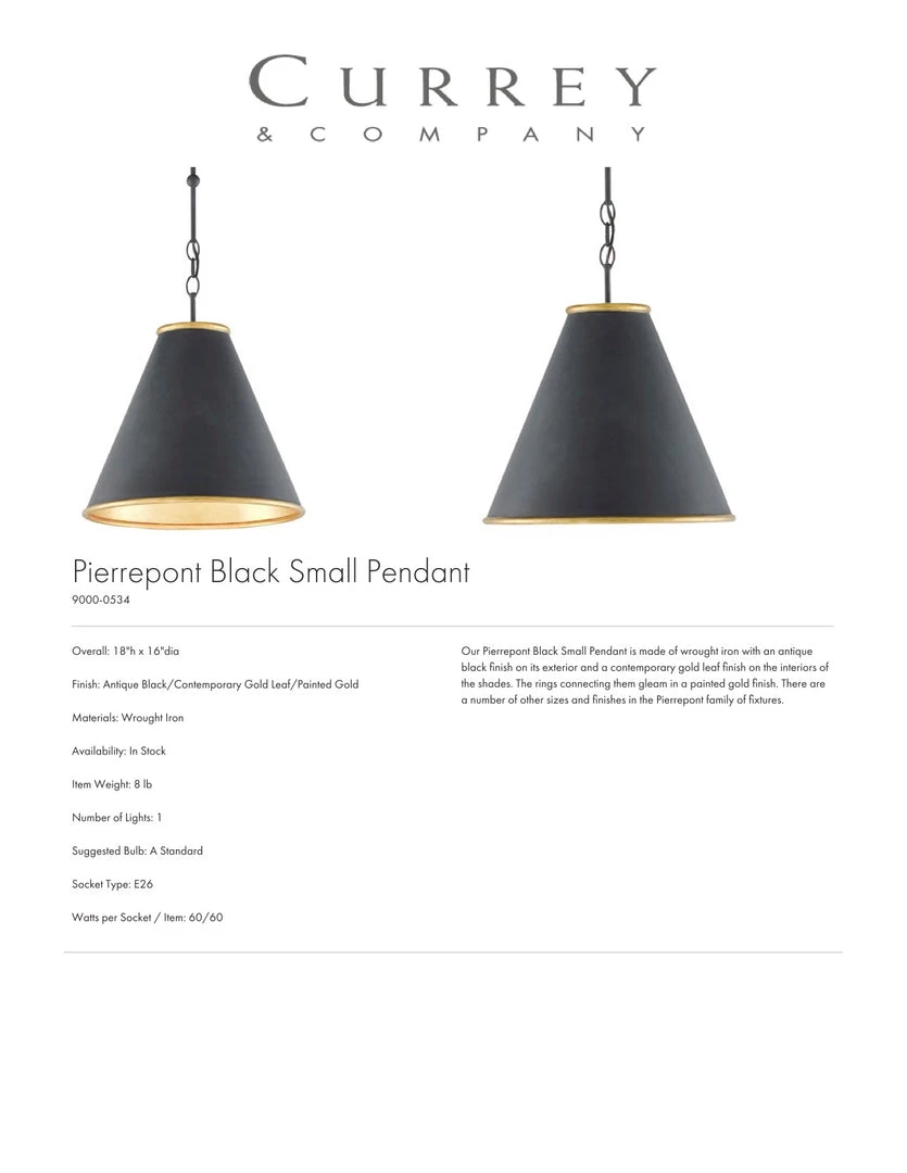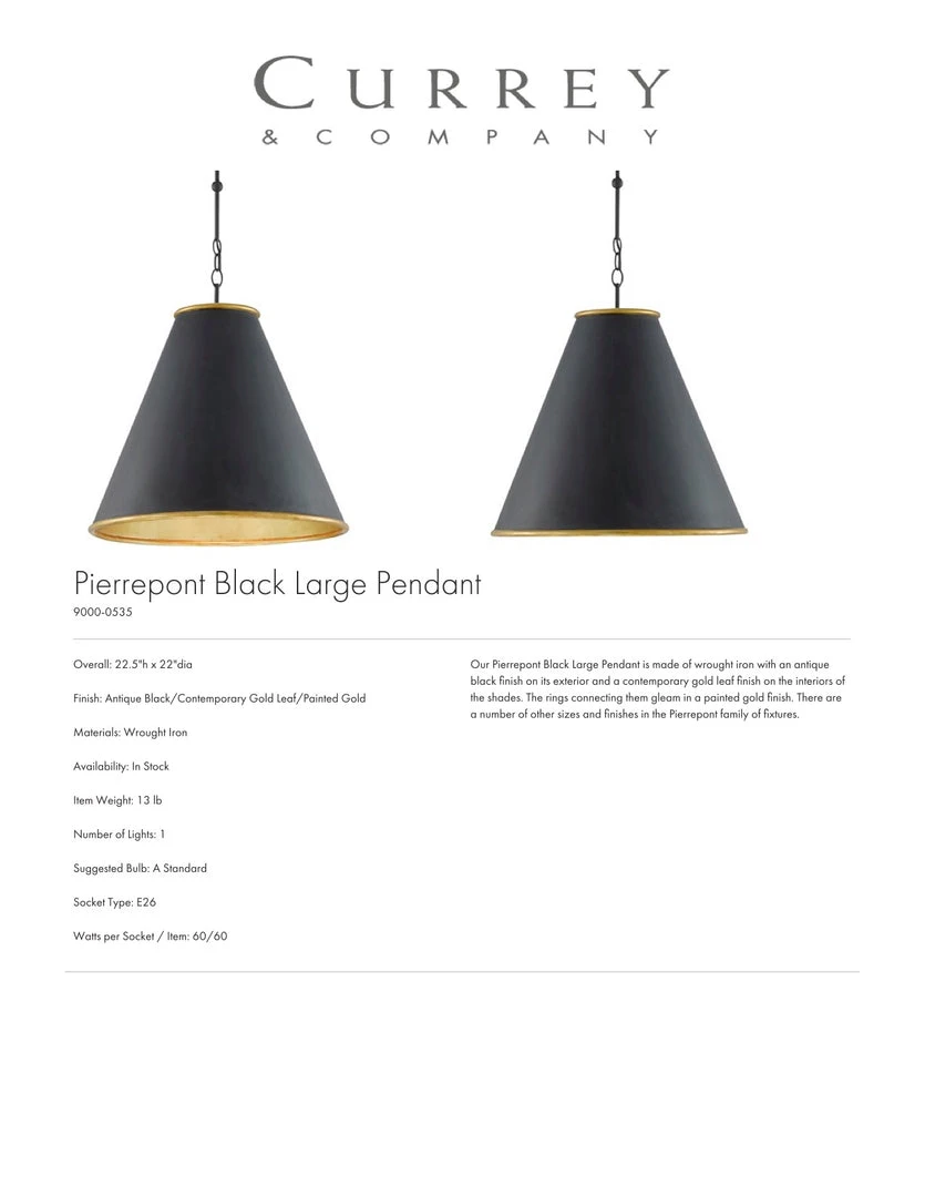 SKU: currey-and-company-4388758093872 Categories: Bedroom, Brands, Currey & Company, Dining Room, Kitchen, Kitchen & Dining, Lighting, New, New Arrivals, Pendants, Pendants, Pendants Tags: Black metal pendant, Cone, Currey & Co. Pendants & Chandeliers, Currey and company, Currey and company accent lighting, Currey and company lighting, Instock, Pierrepont pendant black