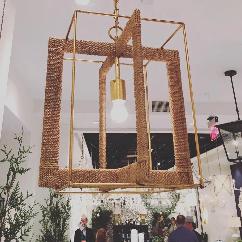 The Currey and Company Purebred Large Chandelier is a striking geometric fixture composed of natural rope rectangles within a slender rectangular frame around four candelabra lights. The contrast of strong lines with natural abaca rope and gold leaf on wrought iron suggests modern as well as coastal or rustic styling. At 36 inches high, the Purebred Chandelier lends long, clean, graceful lines to your foyer or works as a dramatic complement to a two-story staircase.