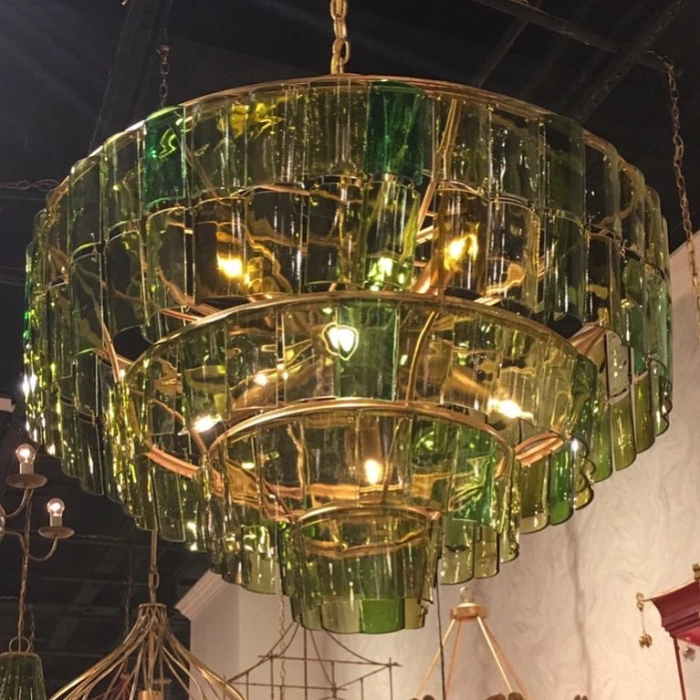 | Materials | Wrought Iron; Dark Contemporary Gold Finish; Bottle Glass; Green; Requires Eight 60watt Candelabra Bulbs (extra chain available on request) |