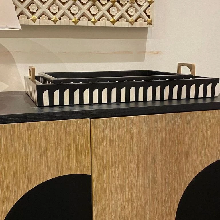 Currey and Company showcases the Swoop Tray Set of Two, designed by Jamie Beckwith. The design is based on a strong graphic shape that comes alive with the contrasting of pieces of bone and composite in ivory and black along the surface. Originally created in bold patterns for vertical and horizontal surfaces, Beckwith says of the Swoop, “I was inspired by mid-century design, specifically Italian designer Gio Ponti, when creating the Swoop pattern. I especially like the idea of curves with straight lines found in Swoop. There is a feminine but masculine feeling to these designs which work well in many environments, and that is due specifically to the shape.