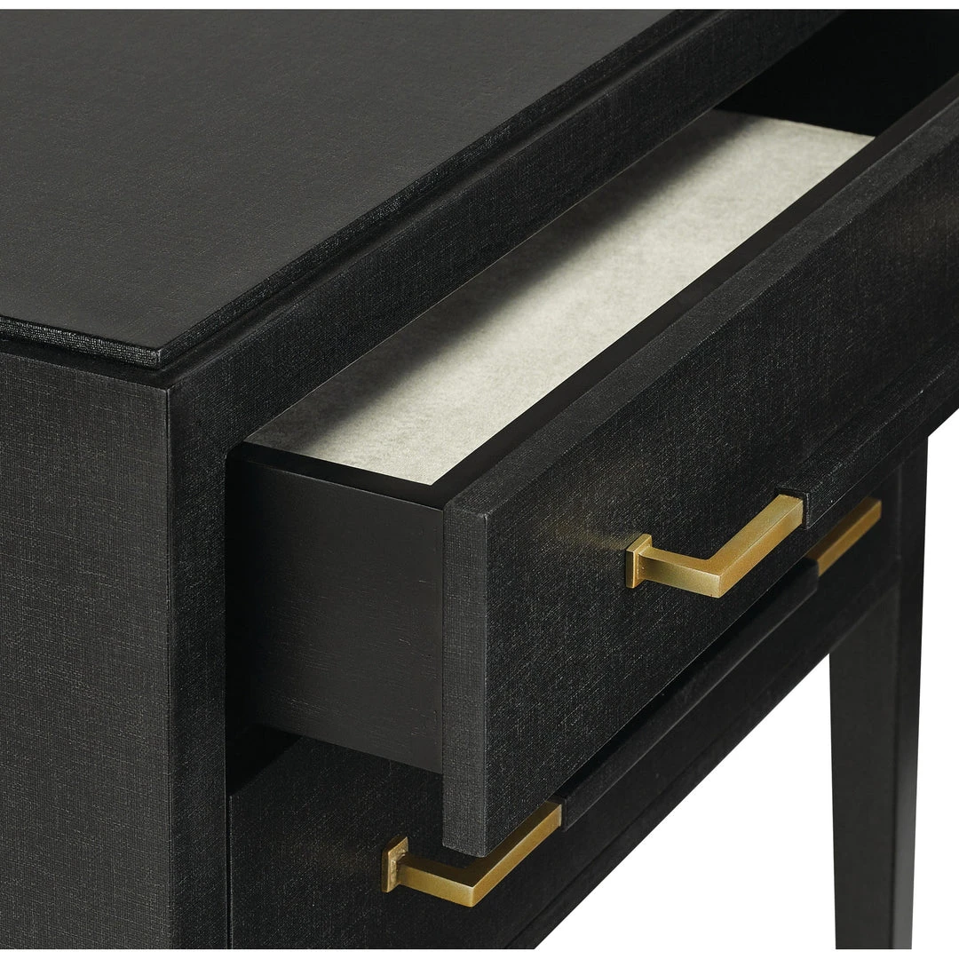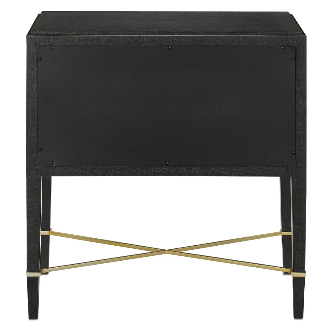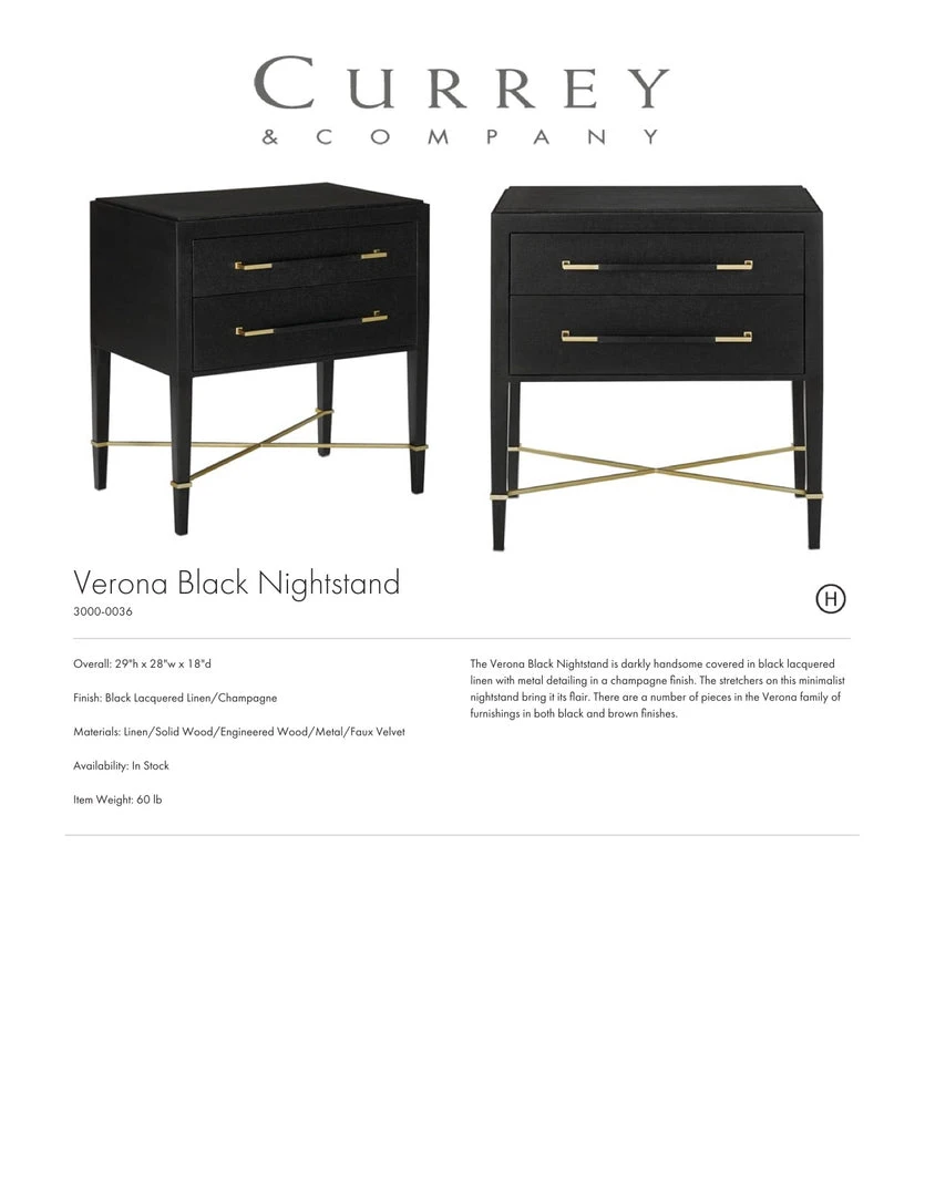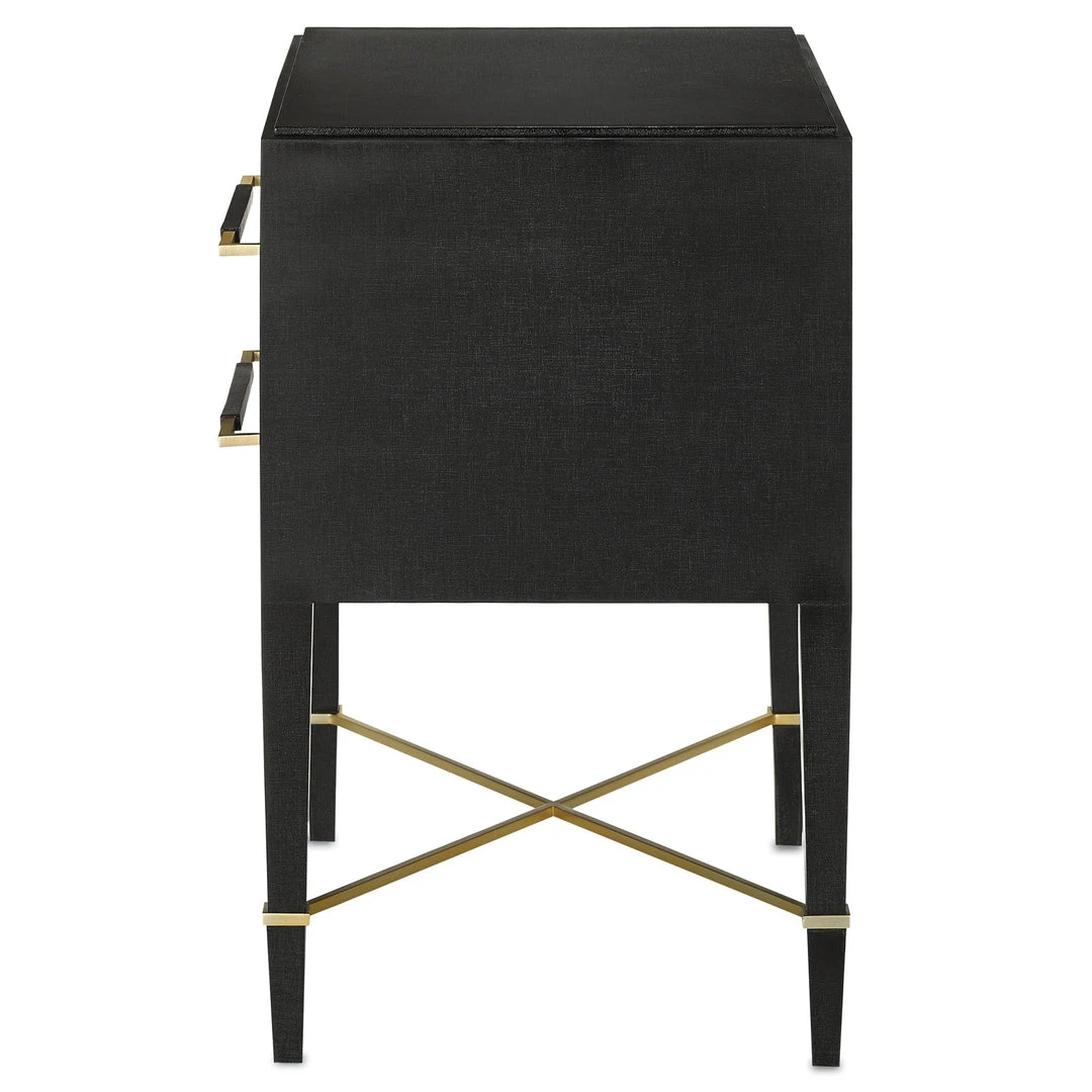The Currey and Company Verona Nightstand is beautifully crafted from solid wood and detailed with black lacquered linen. The Verona collection offers a dramatic and sleek aesthetic for your bedroom as well as versatility and functionality. The two-drawer Verona features linen-wrapped champagne metal and silver mink velvet liners.