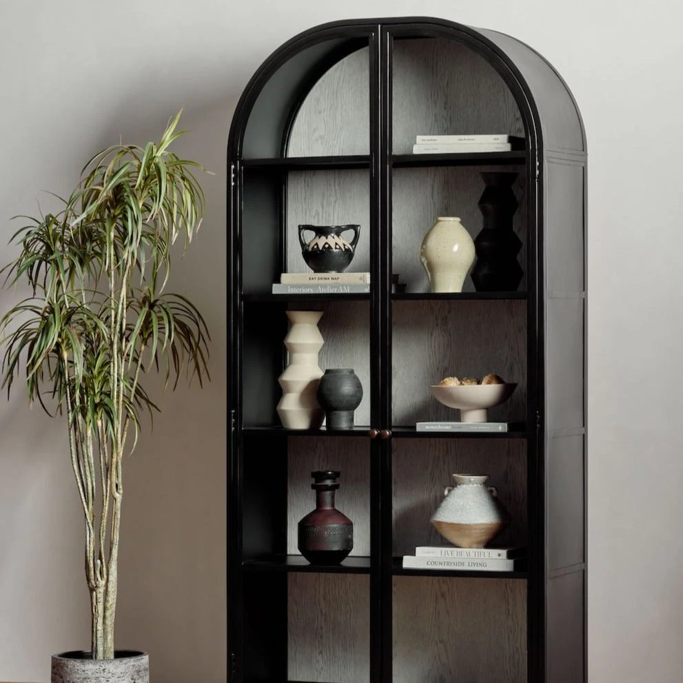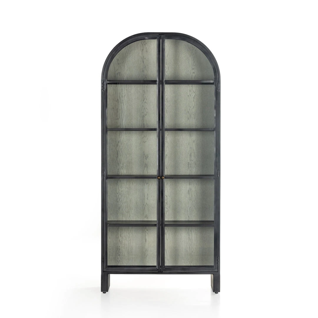 Store it in style with the Breya Cabinet in Vintage White Oak from Four Hands. Made from black-finished iron, beautifully arched cabinetry features glass-front doors, ideal for storing and displaying favorite books, photos, keepsakes, and more.
