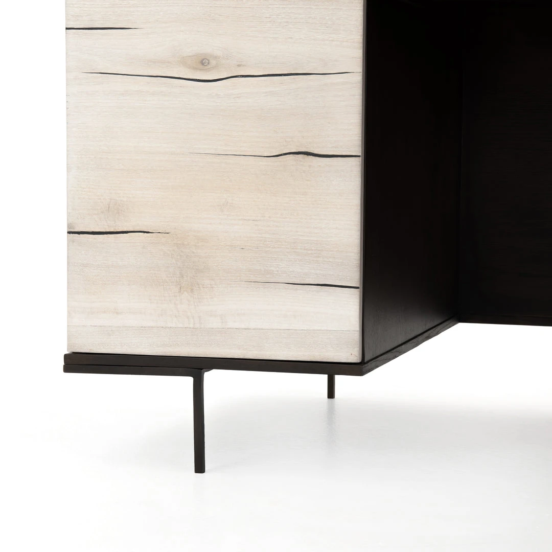 The Cuzco Desk in Bleached Yukas from Four Hands features slender legs of gunmetal-finished iron supporting a black ash frame, as resin fills the natural graining of bleached yukas. Center drawer and side cabinetry offer plenty of space for convenient office storage. Pattern and depth of resin lowlights and highlights vary from piece to piece, due to wood species’ inherent nature.