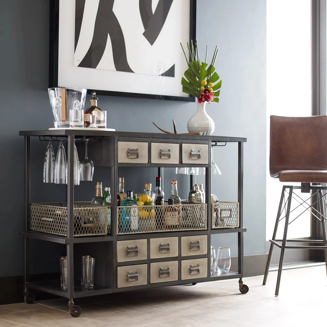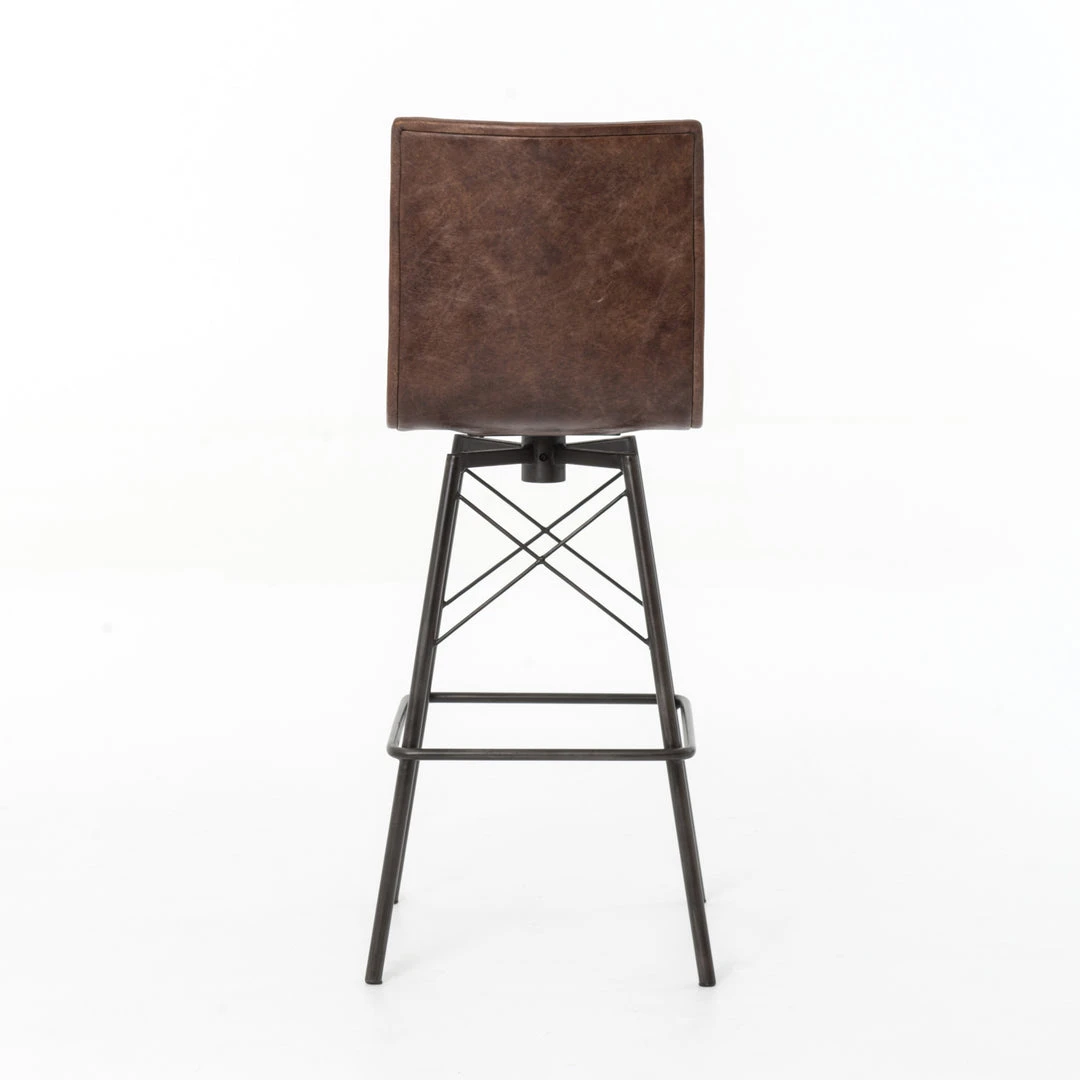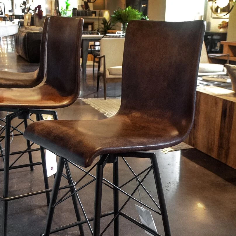 The Diaw Bar Stool from Four Hands features faux leather and a black iron base bringing an architectural design to your space. The mid century style of the Diaw is a sophisticated addition to your kitchen or home bar. Modern S curves in a distressed brown faux leather swivel 360 degrees above a shapely, black waxed iron base. *Leather coloring will vary.