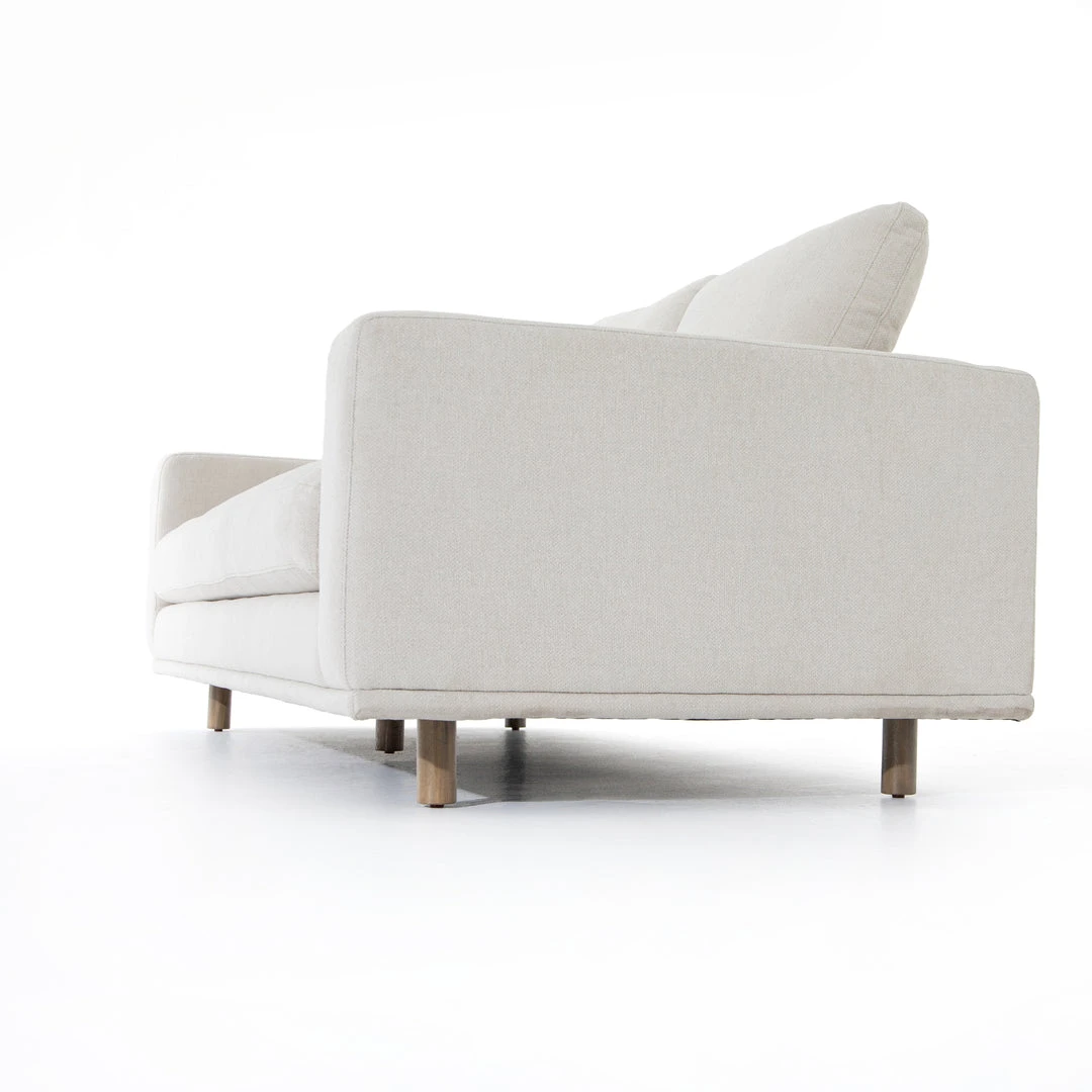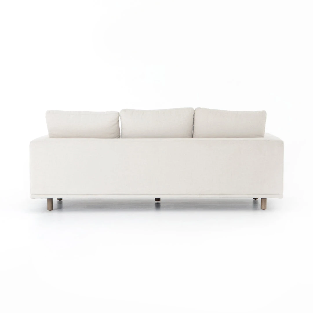 Performance-grade fabric brings surprising livability to a show-stopping silhouette with the Dom Sofa in Bonnell Ivory from Four Hands. Pristinely tailored ivory upholstery exudes elegance, with clean track arms and loose feather-blend cushioning for total comfort. Perfect for living spaces and offices alike the Dom brings comfortable luxury to any space.