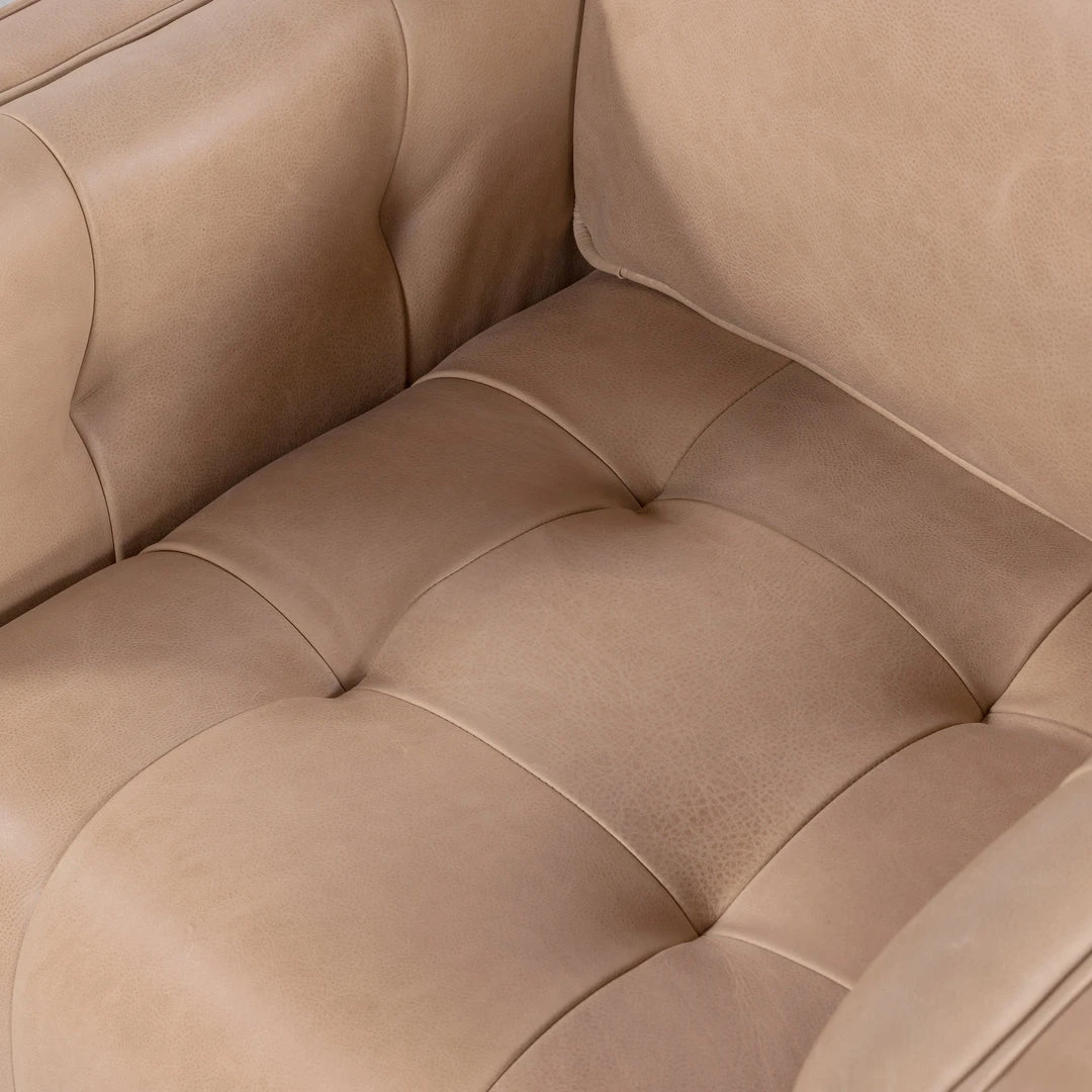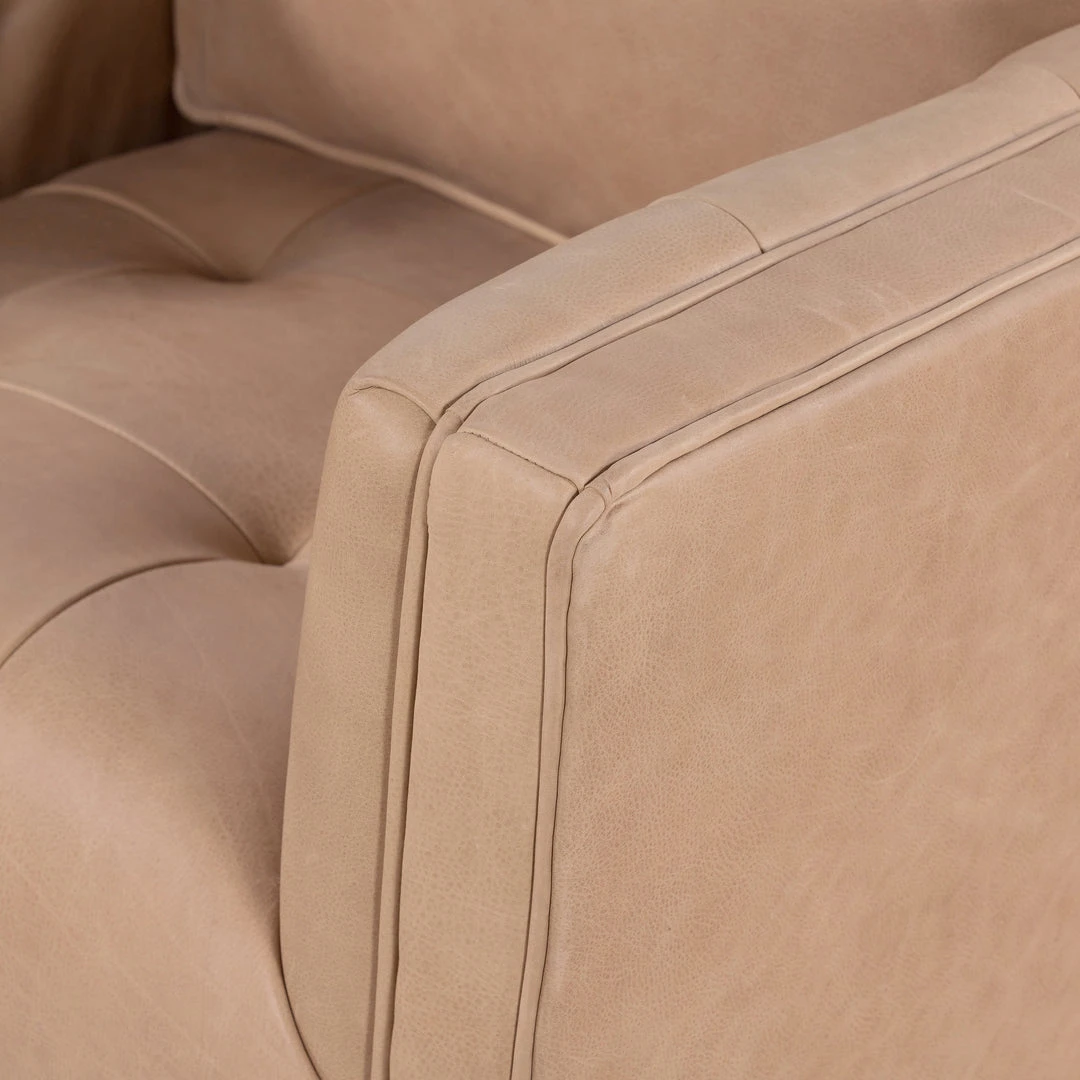 The Kiera Swivel Chair in Palermo Nude from Four Hands features streamlined shaping enriched by luxurious material. Ivory top-grain leather covers clean-angled arms for a tailored look, while blind tufting delivers an aura of depth.The whitewash parawood swivel base flows effortlessly with a monochromatic vibe.