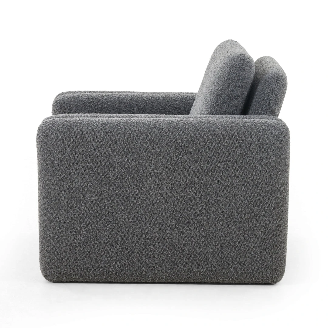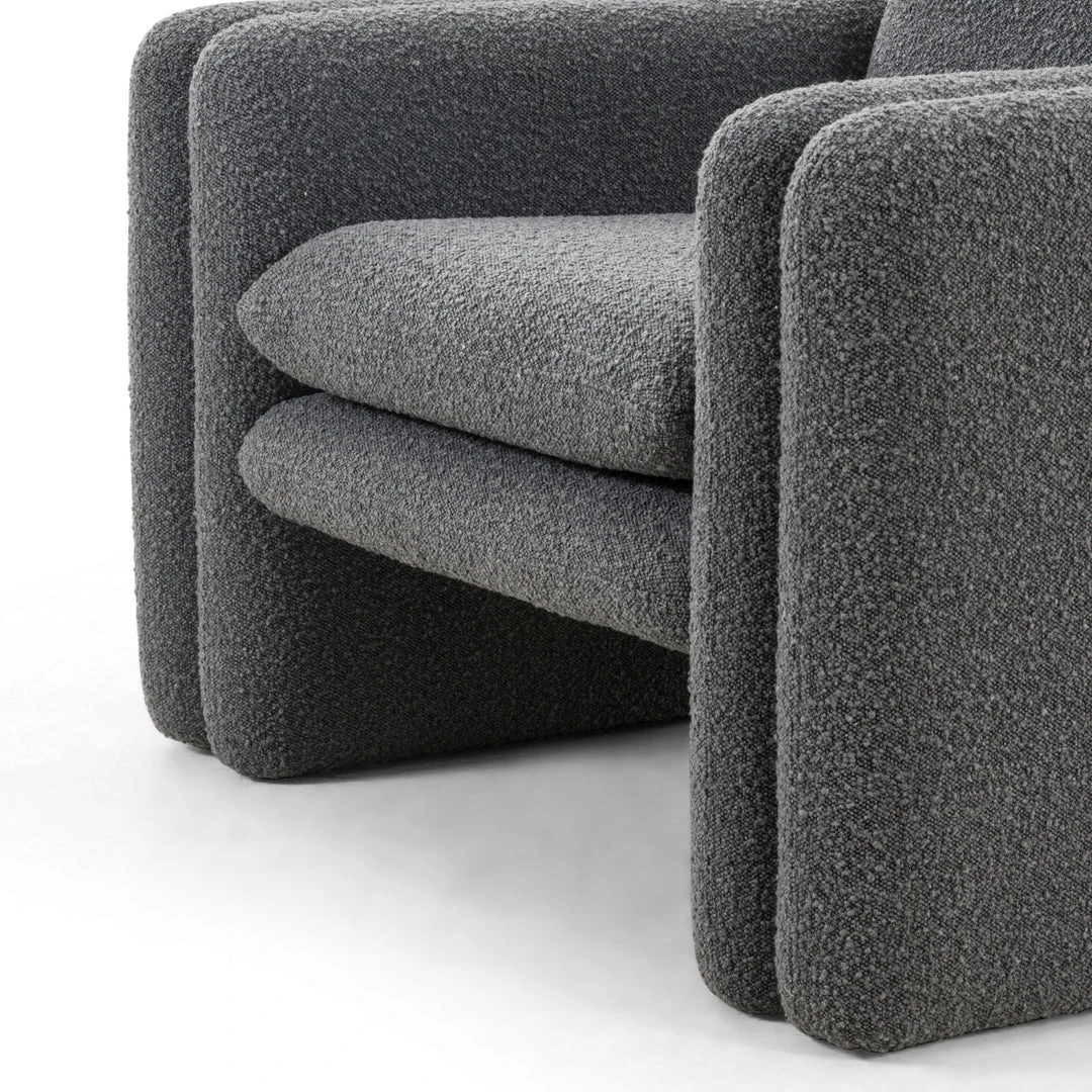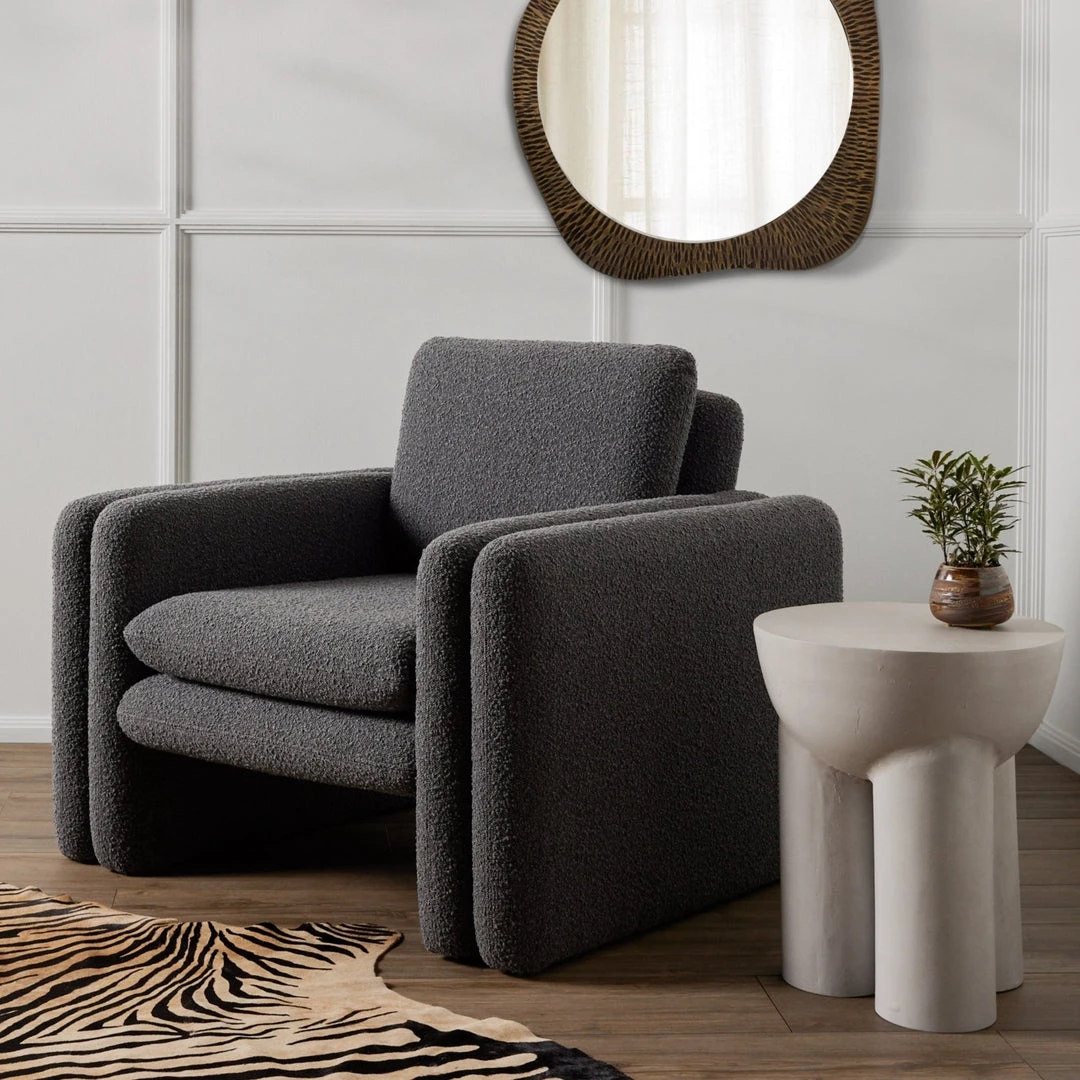 The Kimora Chair in Charcoal Natural from Four Hands features a sense of Eighties-inspired drama. Doubled channeling adds a layered, linear look to boucle-upholstered seating, with loose feather-fiber blend cushioning for comfort. The Kimora adds designer style to living spaces, offices, and bedrooms alike.