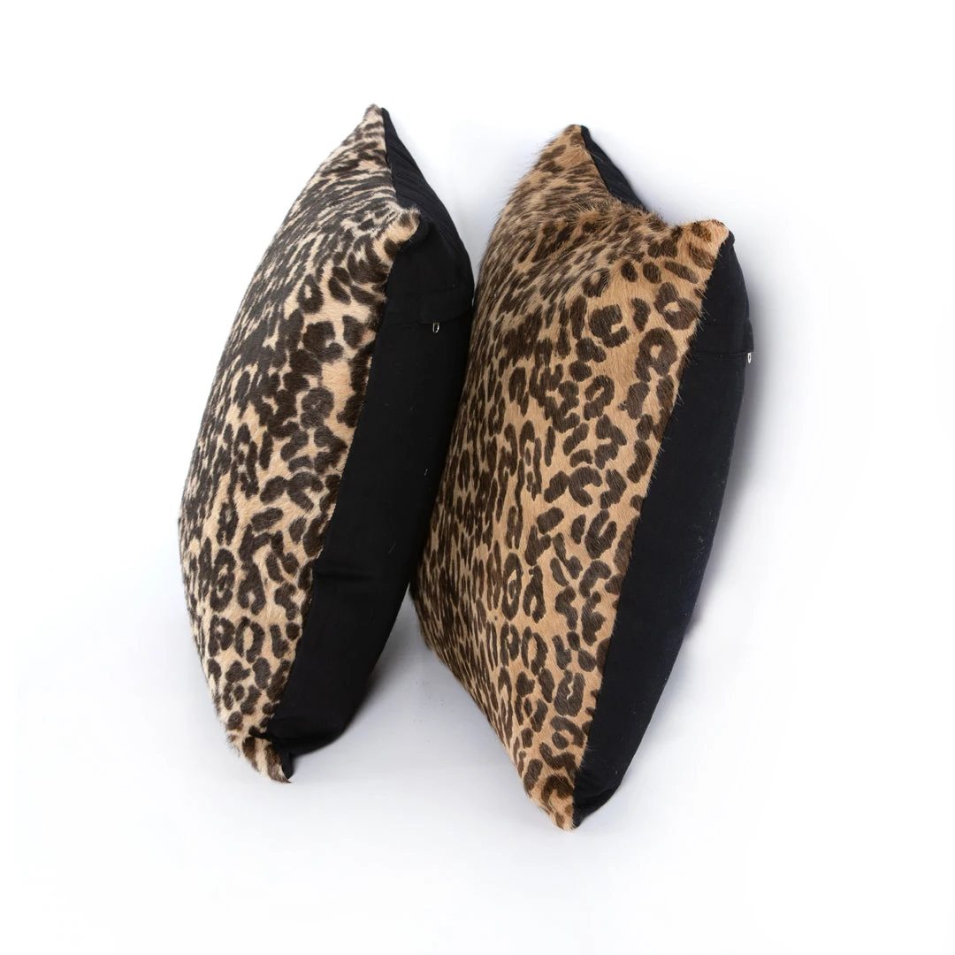 Authentic cowhide adopts a fresh leopard print for fashion-forward flair with the Leopard Print Pillow Set from Four Hands. Variance in color and pattern is to be expected and speaks to the one-of-a-kind nature of these exotic hair-on-hide pillows. Chromium-free processing ensures eco-friendly tanning without the use of dyes. Example hides shown; each set will reflect its own unique character in a range of natural hues. No two hides are the same. *Inserts included.