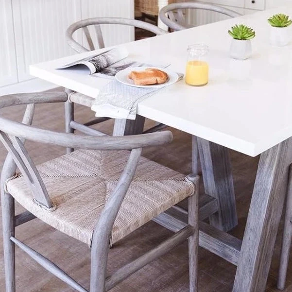 The Muestra Dining Chair in Weathered Gray from Four Hands is showcased in a teak finish with synthetic weaving. The modern feel to this design is supported by the curves as well as the classic wishbone seating. The all-weather wicker works perfect juxtapose the vintage white coloring. Chairs such as the Muestra Dining Chair from Four Hands is ideal in your dining room or can be used with your outdoor setting. *Cover or store indoors during inclement weather.
