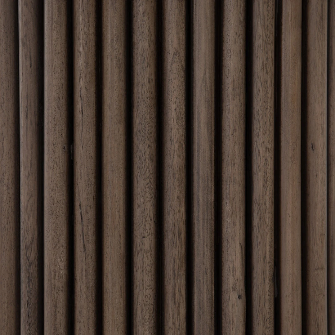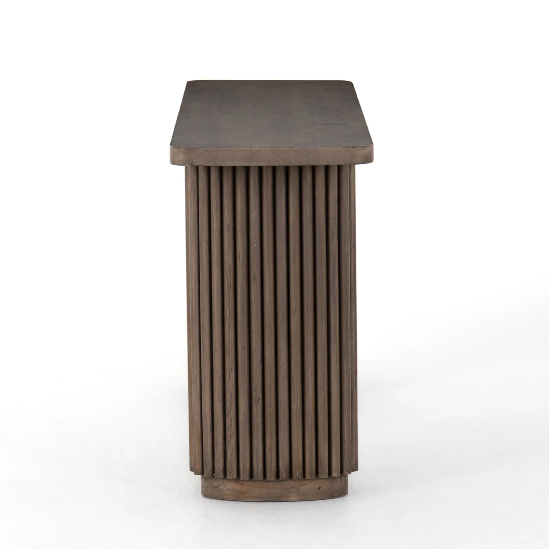 Inspired by décor in the majestic palaces of Jaipur, the Rutherford Console Table in Ashen Brown from Four Hands is a conversation-starting piece. Made from mixed reclaimed woods, the Rutherford features a rounded rectangular top and pedestal legs with vertical reeding atop a sleek plinth base.