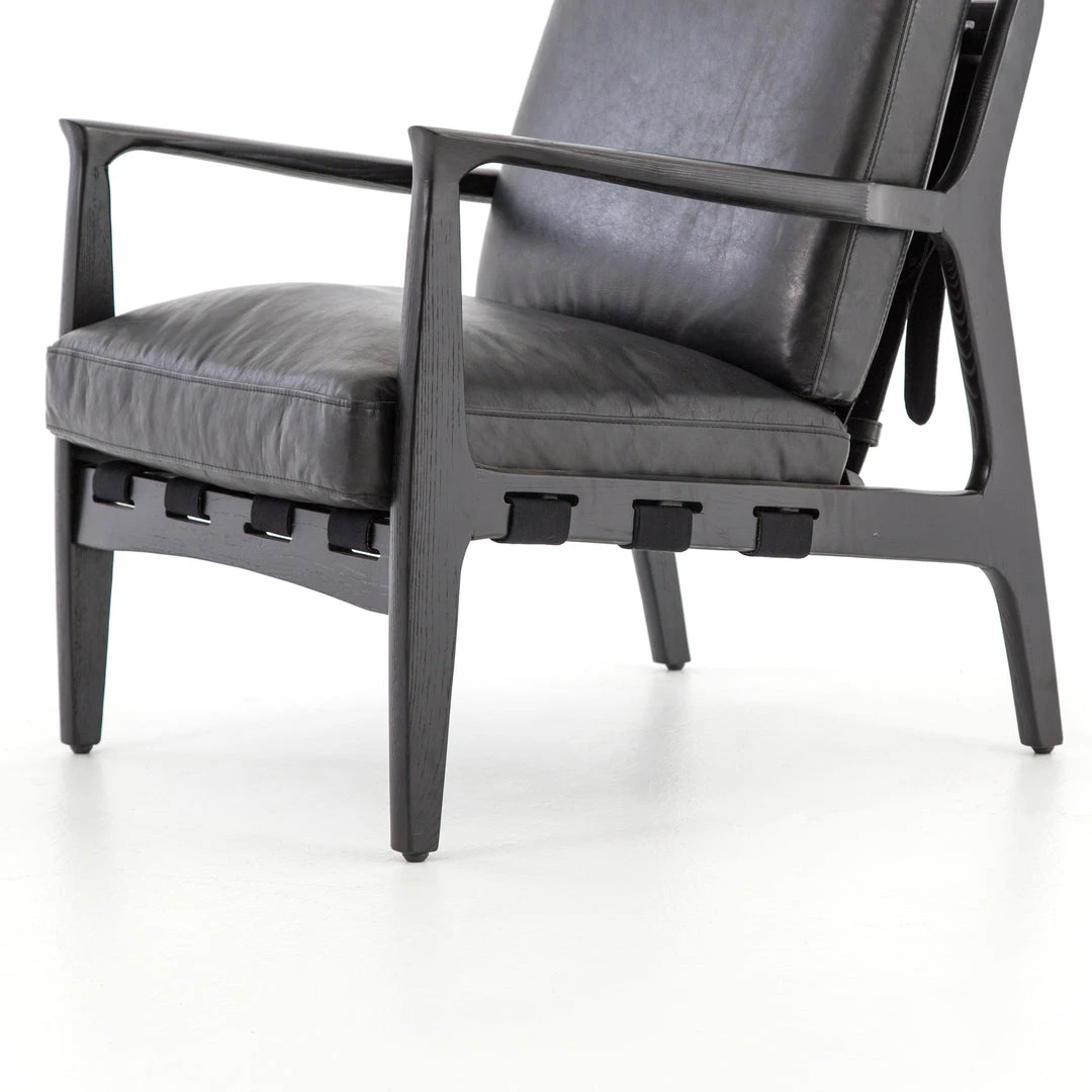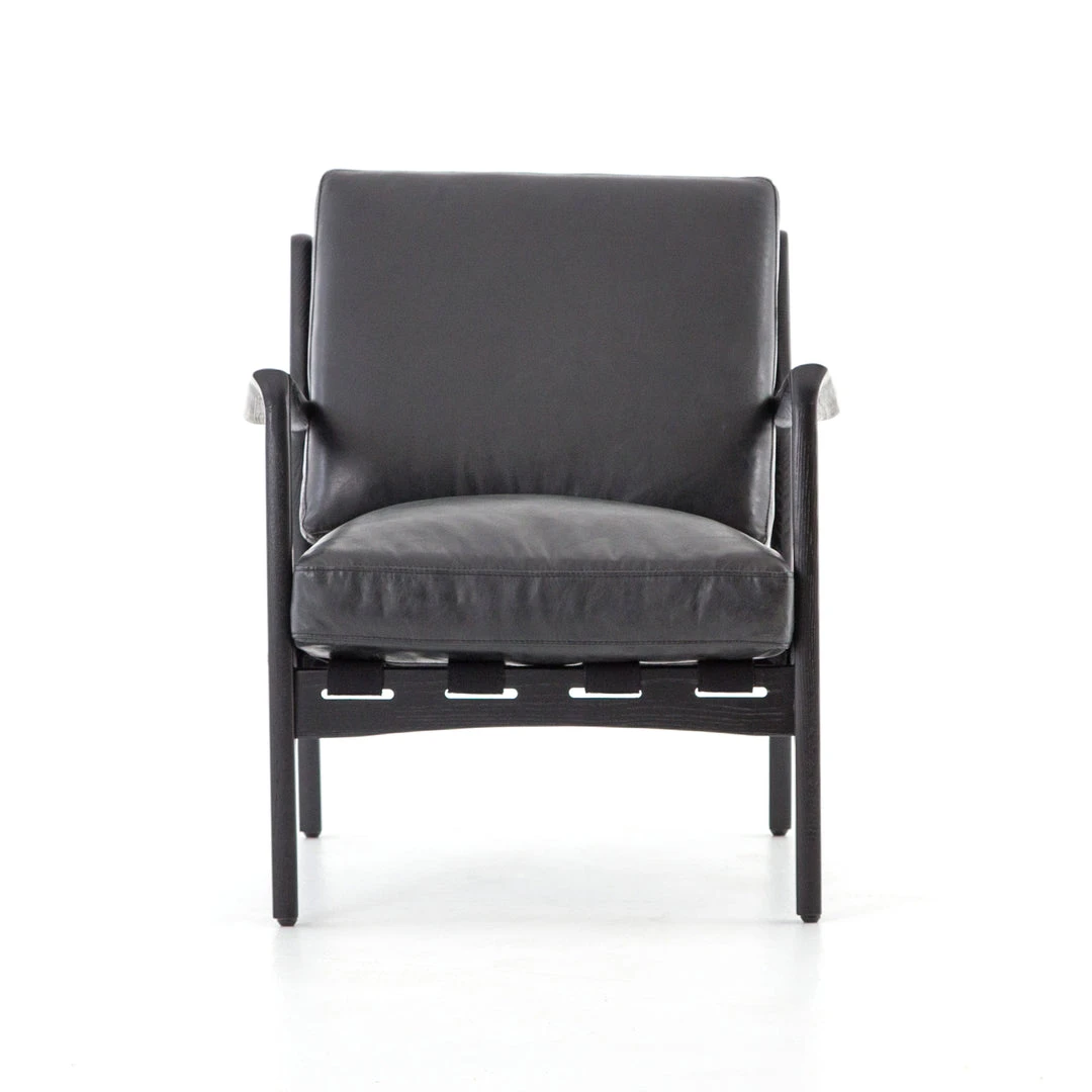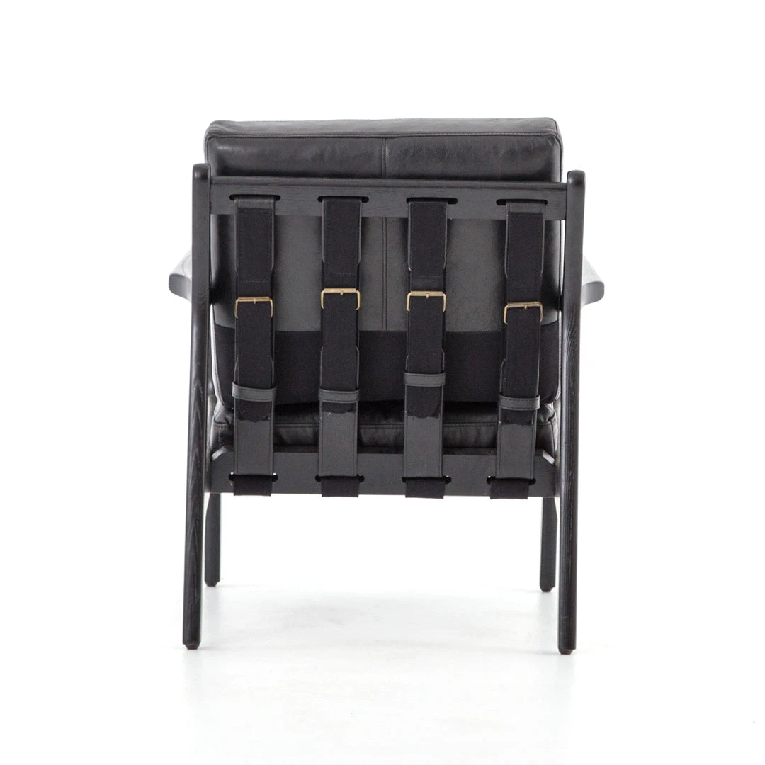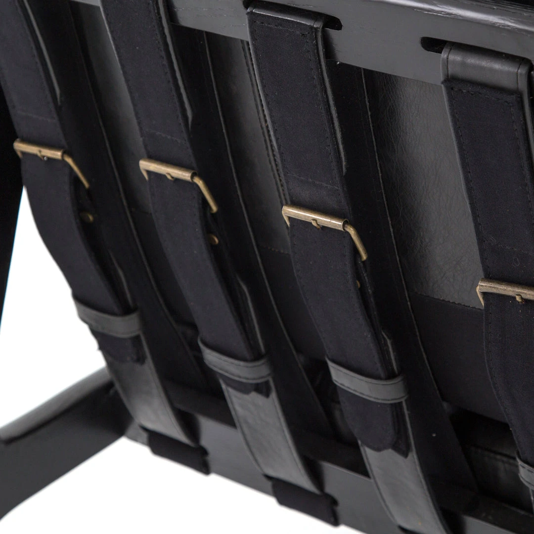 The Silas Chair in Aged Black from Four Hands features a striking silhouette with design forward details at every angle. Top grain, handcrafted leather sits in a solid ash, ebony frame held by parachute strapping made of canvas, leather and metal buckles. The Silas is the ideal chair for the home office, library or living room.