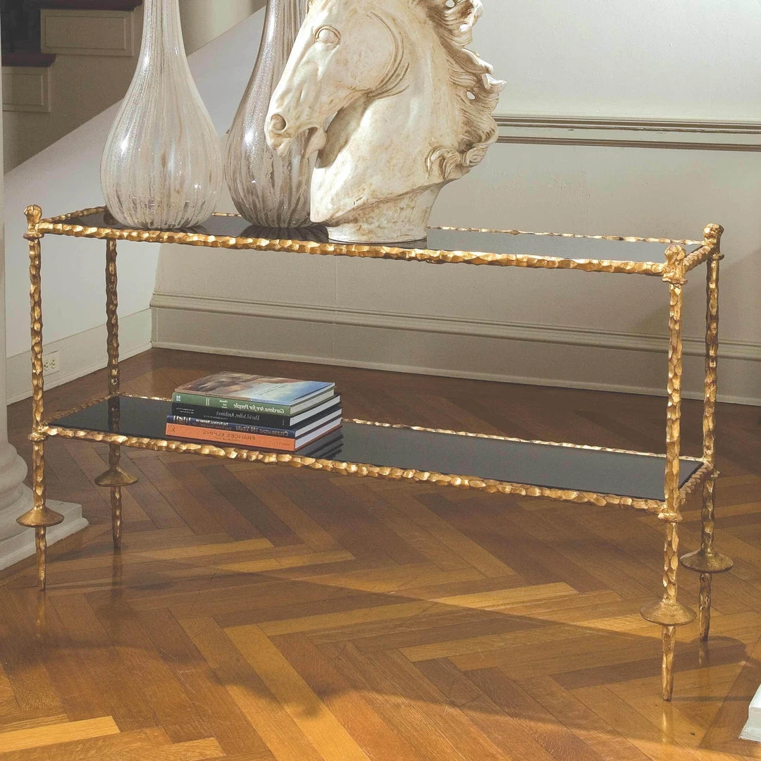The Global Views delivers the Gold Chiseled Console Black Granite, this impressively handsome wrought iron piece features a hand applied antique gold metal leaf finish and two black granite shelves. Mid-twentieth century craftsmanship is evidenced in the stunning Gold Chiseled Console from Global Views. Ideal for an entry or in a large living area. *Granite shelves are boxed separately.