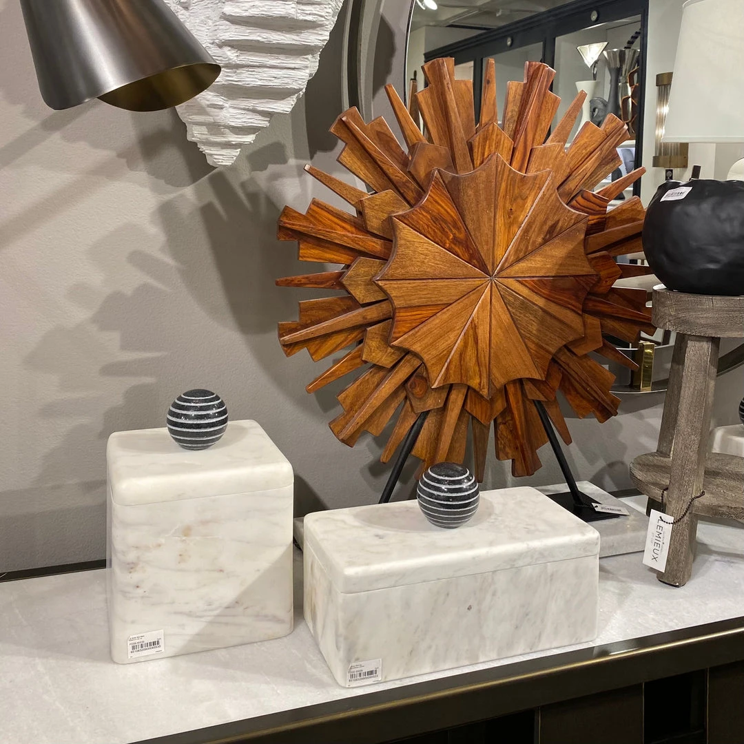 Carved from a solid piece of white marble with an etched black marble handle, the La Boite marble Box Set of Three features elegant curves and bold proportions make it as visually arresting as it is functional. Designed by the exclusive FORM Design Studio for Global Views, place these elegant decorative accessories on entryway consoles, shelving, or desktops for instant designer style.