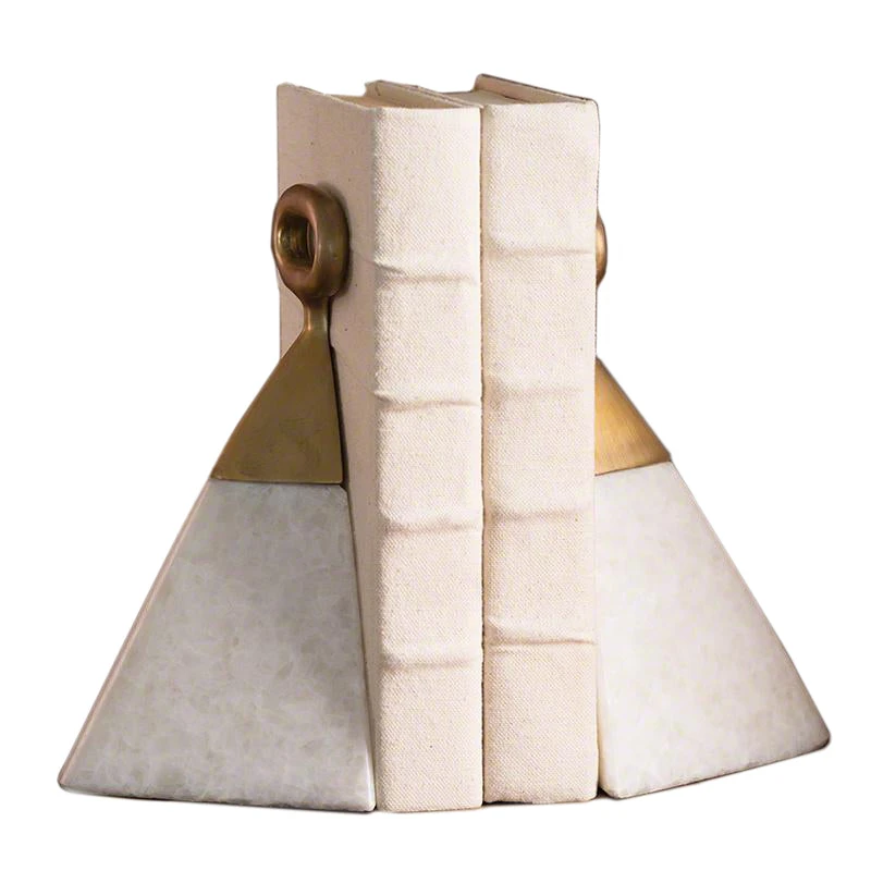 Global Views presents Equestrian Marble Bookends featuring an artful mix of the abstract and equine.The white marble bases are topped with a brushed brass stirrup detail, adding a touch sophistication to your bookshelves. These bookends make a handsome display in a home office, living room or library and are a perfect gift for the book collector!