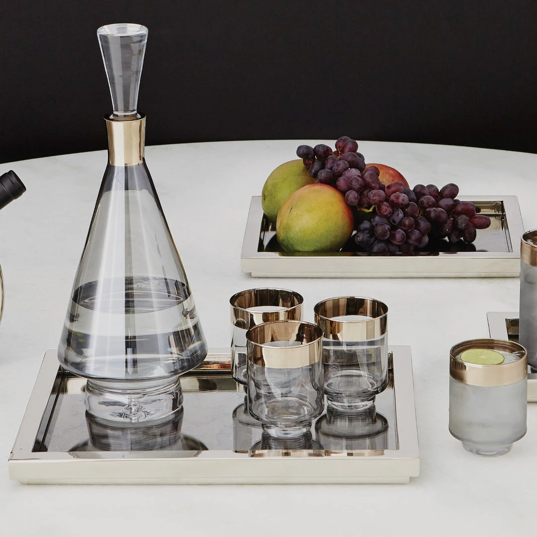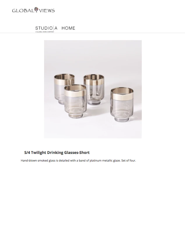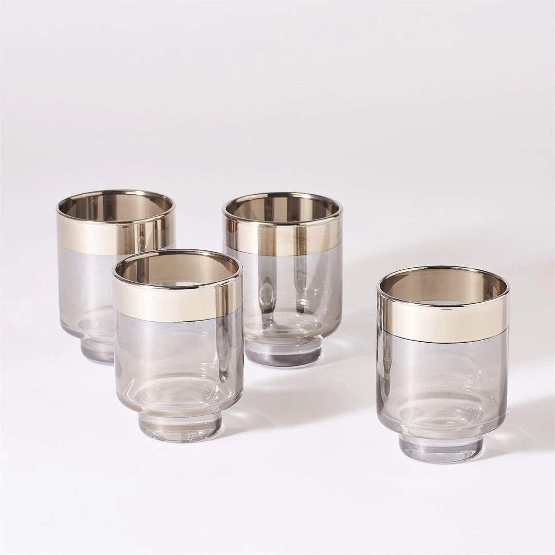 The Twilight Short Drinking Glass Set of 8 by Global Views is crafted from hand-blown smoked glass and detailed with a band of platinum metallic glaze. This set of 8 drinking glasses presents beverages with sleek elegance. Streamlined tumblers with a metallic twist, these glasses are ideal to complete your home bar or are a perfect choice for a chic hostess gift.