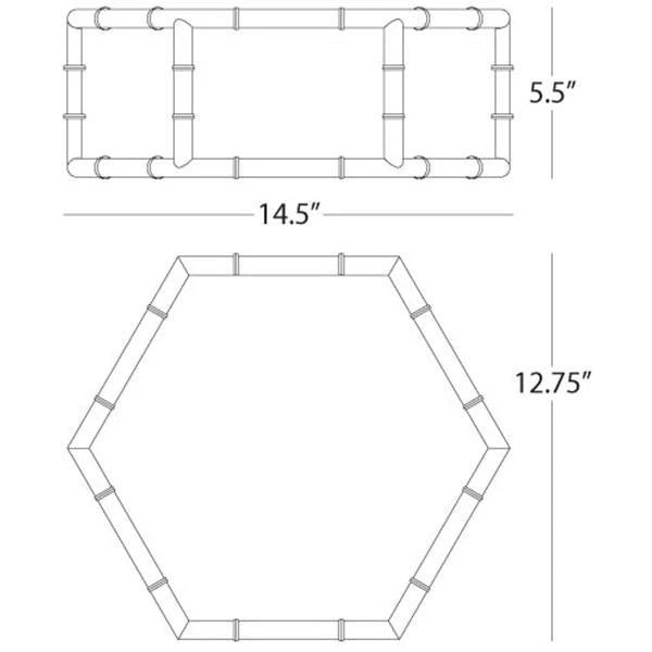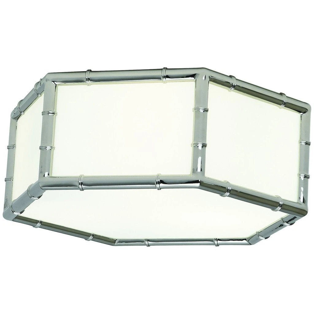 The Meurice Flush Mount from Jonathan Adler offers a finely crafted cage of squares distinguishing this Hexagonal flush mount light. The contemporary light features white glass shade panels in a Polished Nickel bamboo finish. This Meurice Flush Mount adds the perfect glow for spaces like bathrooms and entryways. UL listed for damp conditions.