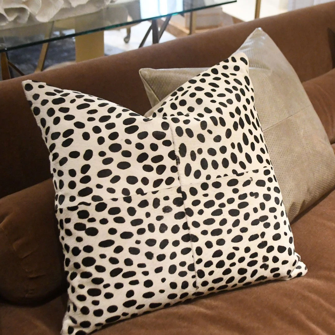 The Abram Square Pillow from Made Goods features a design of four patchwork hide spot panels of Dalmatian print. Bring a touch of whimsical, visual interest to any chair, sofa or bed. Available in two square sizes, this enticing, touchable accessory works well anywhere in your home. Mix this luxurious pillow with other prints and fabric textures to create a sumptuous flair in your decor scheme. Sold as a set of 2 only.