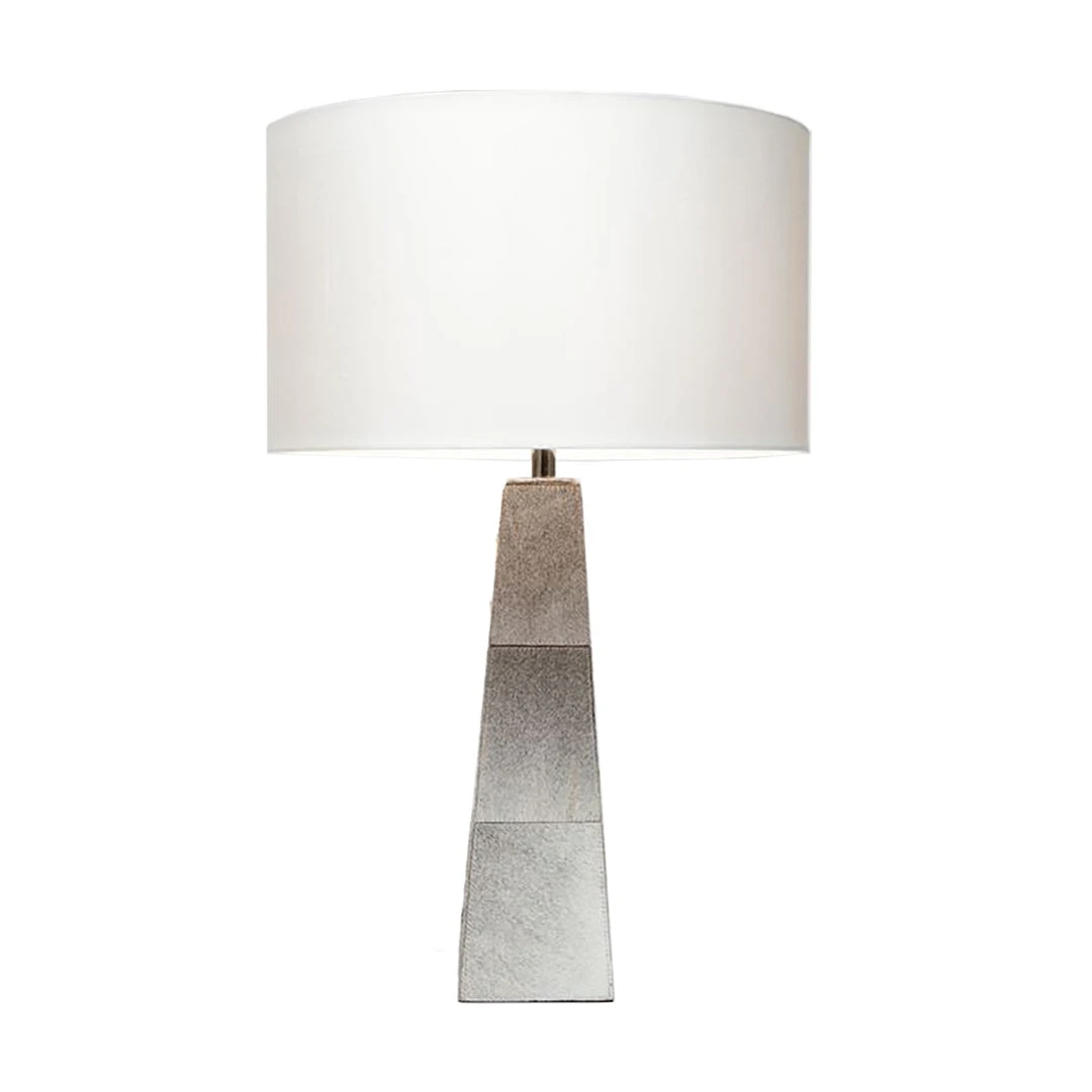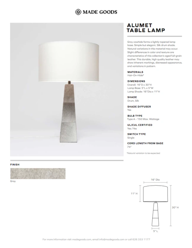 The Alumet Table Lamp from Made Goods features gray cowhide wrapped around a lightly tapered lamp base. This simple but elegant lamp is topped with a white silk drum shade. Natural variations in this material may occur. Slight differences in color and texture are characteristics of this collection’s aged full-grain leather. This durable, high-quality leather may show inherent markings, distressed appearance, and variations in pattern. Pair this striking lamp with the Alumet Floor Lamp for the complete look.