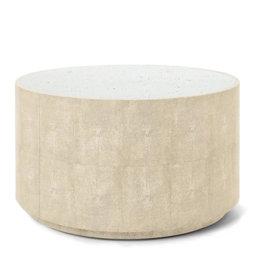 Made Goods presents the Cara Cocktail Table in a neutral Ivory color on a modern faux shagreen finish. This modern round coffee table is topped with luxe antiqued mirror that adds light and a dramatic presence to your living room or family room. Coffee tables like the Cara provide tabletop space for a decorative centerpiece and a place for your morning coffee or evening cocktail. *This item is handcrafted and may show slight variation in size from one piece to another.