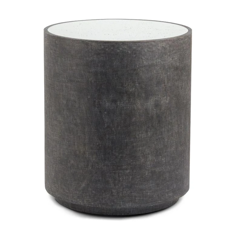 Made Goods Cara Side Table in Charcoal faux linen brings texture and subtle glam to modern furnishings for your home. Antiqued mirror tops this round side table, making it a statement piece wherever it you place it. Side tables like the versatile Cara work beautifully when used as a living room side table or as a bed side table. *This item is handcrafted and may show slight variation in size from one piece to another.