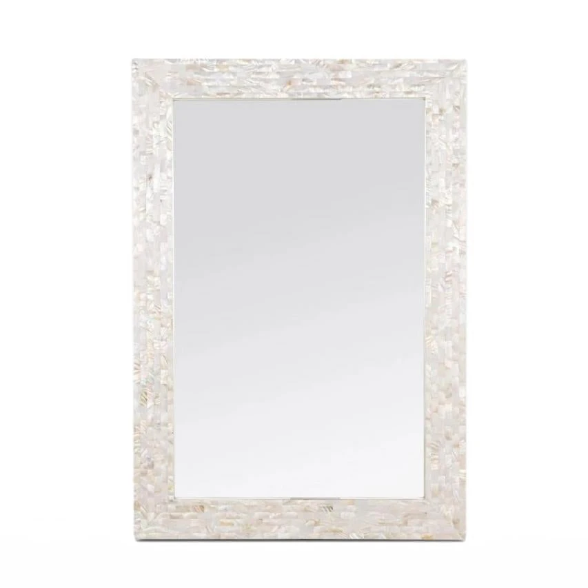 Made Goods Colette Wall Mirror in Kabibe Shell reflects a beach inspired design for your home that is both casual and formal. Neutral shades of white and cream colored shells are arranged in six rows encircling the rectangle shape of this decorative mirror. Hang this versatile mirror in either a vertical or horizontal position based on your wall size. The contemporary Colette brightens your space and gives you an outdoor vibe in your foyer, dining room or living room. Use as vanity mirrors in your bathroom with double sinks or bar mirrors in your home media center.