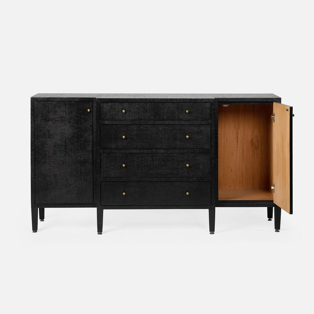 The Conrad Deep Drawer Buffet in Black Faux Raffia from Made Goods is both long and dimensional. Combining design with functionality, the Conrad Buffet is the perfect addition to any space!