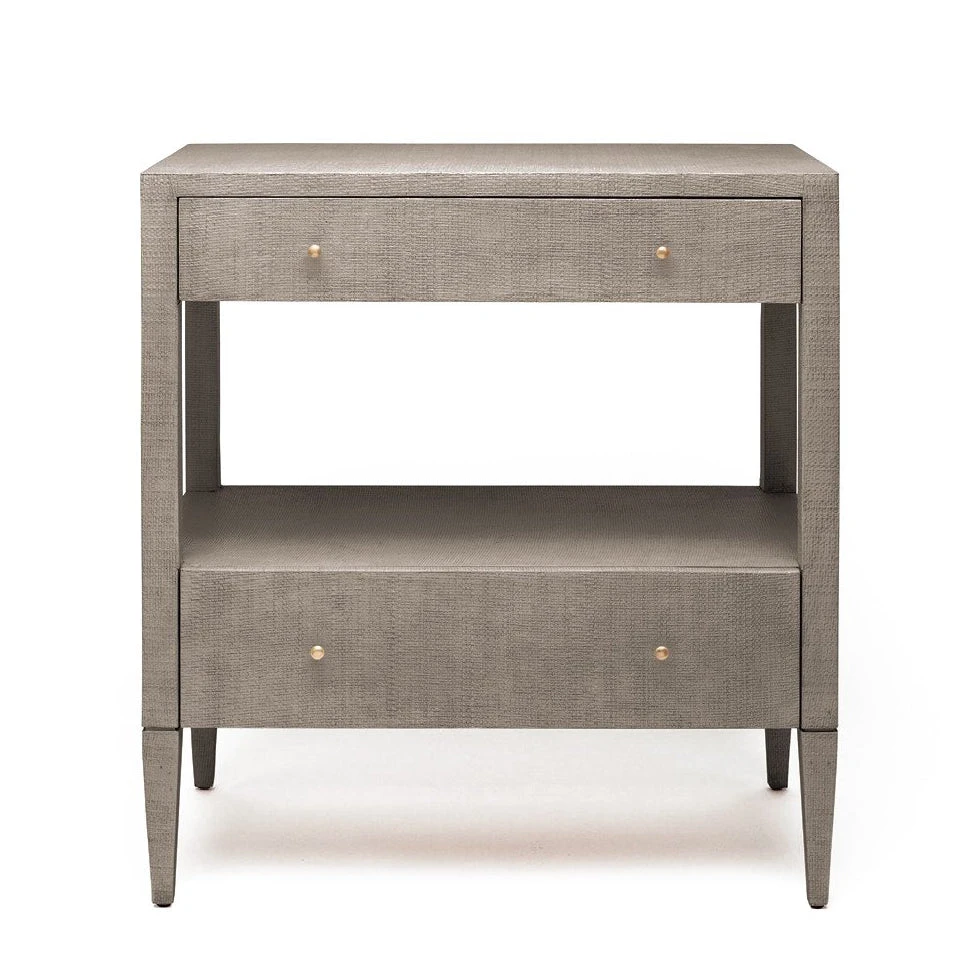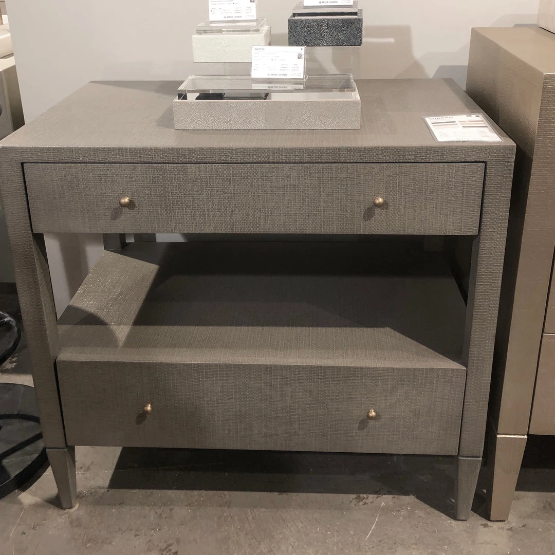Made Goods oversized Conrad Nightstand in Seal raffia showcases a modern bedside table with an open shelf between two self closing drawers with brass knobs. Designed in a rectangle, the versatile Conrad can be used in any sitting area of your home as a side table. Plenty of tabletop surface for a lamp and vase of your favorite flowers along with two storage drawers make it an ideal choice as a living room side table. Place the extra large contemporary Conrad between two chairs in the sitting area of your master suite, family room, or your home office. *This item is handcrafted and may show a slight variation in size from one piece to another.