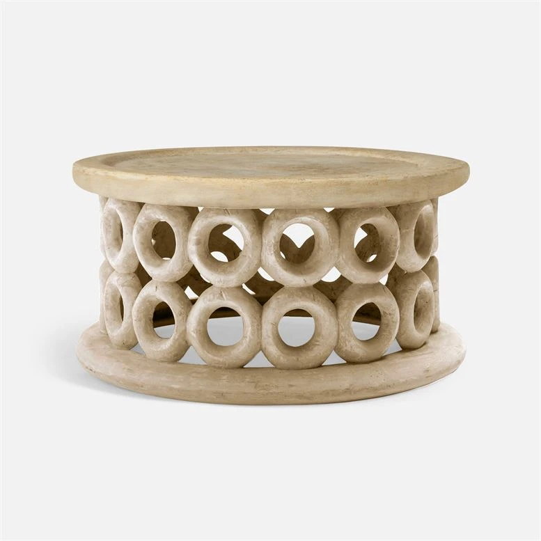 Donut-shaped loops make up the eye-catching graphic structure of the circular Dagen Coffee Table in Distressed Gray from Made Goods. Made entirely of concrete, this hefty coffee table brings some old Hollywood_style to an outdoor deck or garden patio. *Concrete material naturally distresses and minor cracks and imperfections are to be expected.