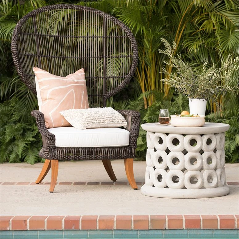 Donut-shaped loops make up the eye-catching graphic structure of the circular Dagen Side Table in Flat White from Made Goods. Made entirely of concrete, this versatile accent table brings some old Hollywood style to an outdoor deck or garden patio. *Concrete material naturally distresses and minor cracks and imperfections are to be expected.