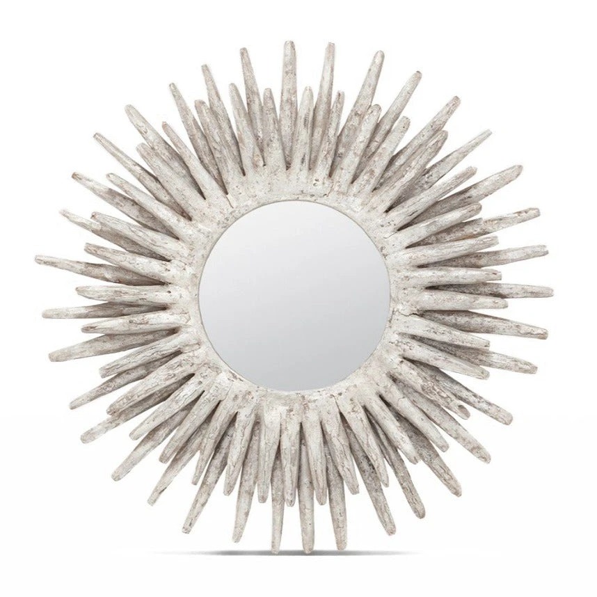 Made Goods offers the strikingly luxe Donatello Mirror in Silver distressed teak wood. Wall mirrors like this timeless sunburst design work especially well in adding more light and dimension to your space. Extra-large, round wall mirrors give your home or office a sophisticated modern, contemporary vibe. Used as dining room mirrors, living room mirrors, bedroom mirrors, or office mirrors, the glamorous Donatello makes a bold decorative statement. *Natural variations in this material may occur.
