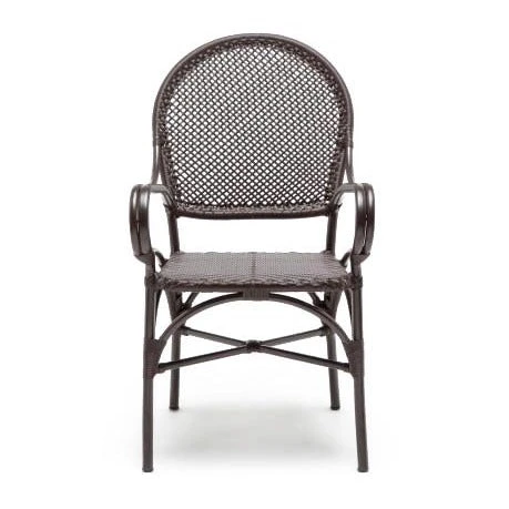The Made Goods Donovan Arm Chair with its gracious curves round out the brown seat. This modern chair is highly versatile with its aluminum construction. The woven seat and back of the Donovan offers a French Bistro feel. Outdoor seating suitable.