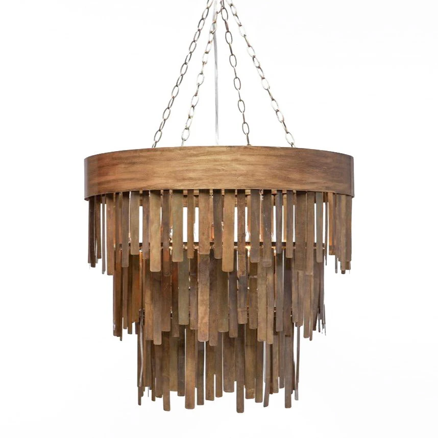 Made Goods Douglas Chandelier in Aged Brass showcases a round design of metal strips in varying lengths hanging from a three tier frame. Chandeliers like the Douglas can be used as foyer chandeliers or bedroom chandeliers. Make a sophisticated decor statement in your home or office with this handsome industrial chandelier.