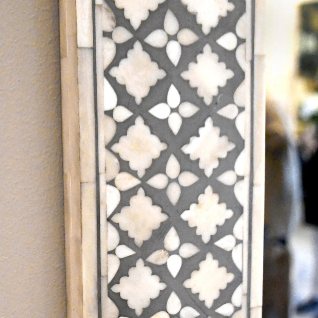 The Dustin Floor Mirror by Made Goods features a rectangle shaped hand creation. The beautiful bone is inlaid in resin creating an exotic Marrakesh pattern. The neutral coloring of the bone allows it to blend in any room and add a level of luxury. This larger design looks great at the end of a hallway or in the bathroom for full view.