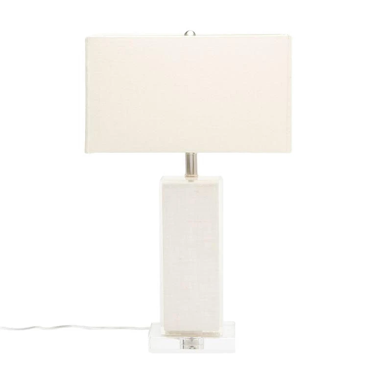The Fabre Table Lamp in Off White Burlap and Clear Resin from Made Goods delivers elegant texture and designer style to your home. The woven burlap finish of the Fabre’s rectangular stand is elevated by a resin encasement. A crystal base adds to its organically modern charm. Place the Fabre in pairs on the entryway console or on either side of the sofa in living rooms and sitting areas.