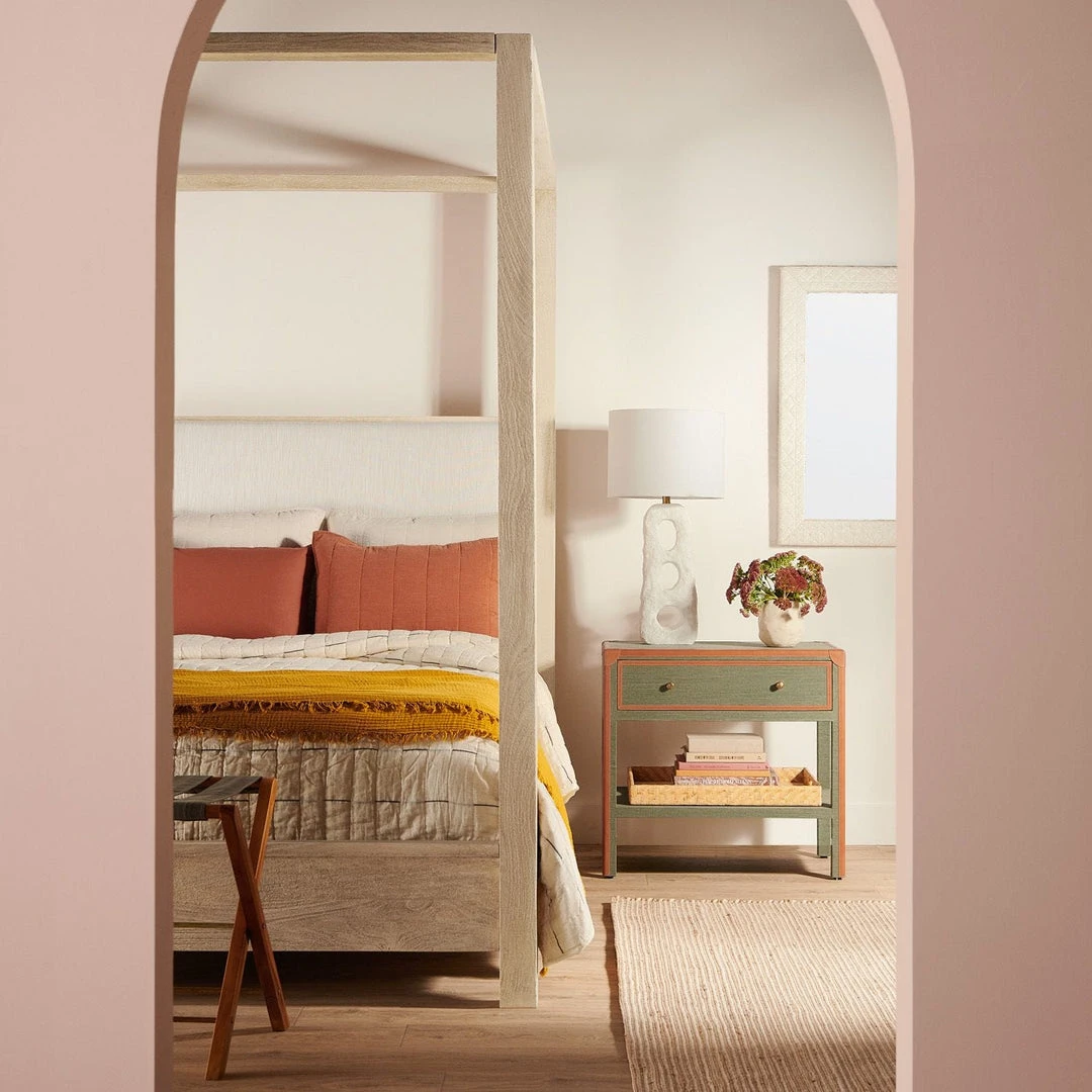The modern, elemental Gregos Table Lamp from Made Goods uses matte white resin to capture the irregular surface and texture of hand-built ceramics. Sculptural cutouts create calming repetition and an airy lightness.