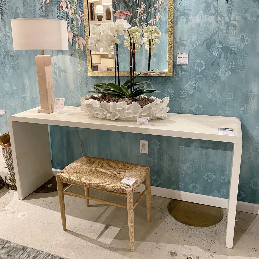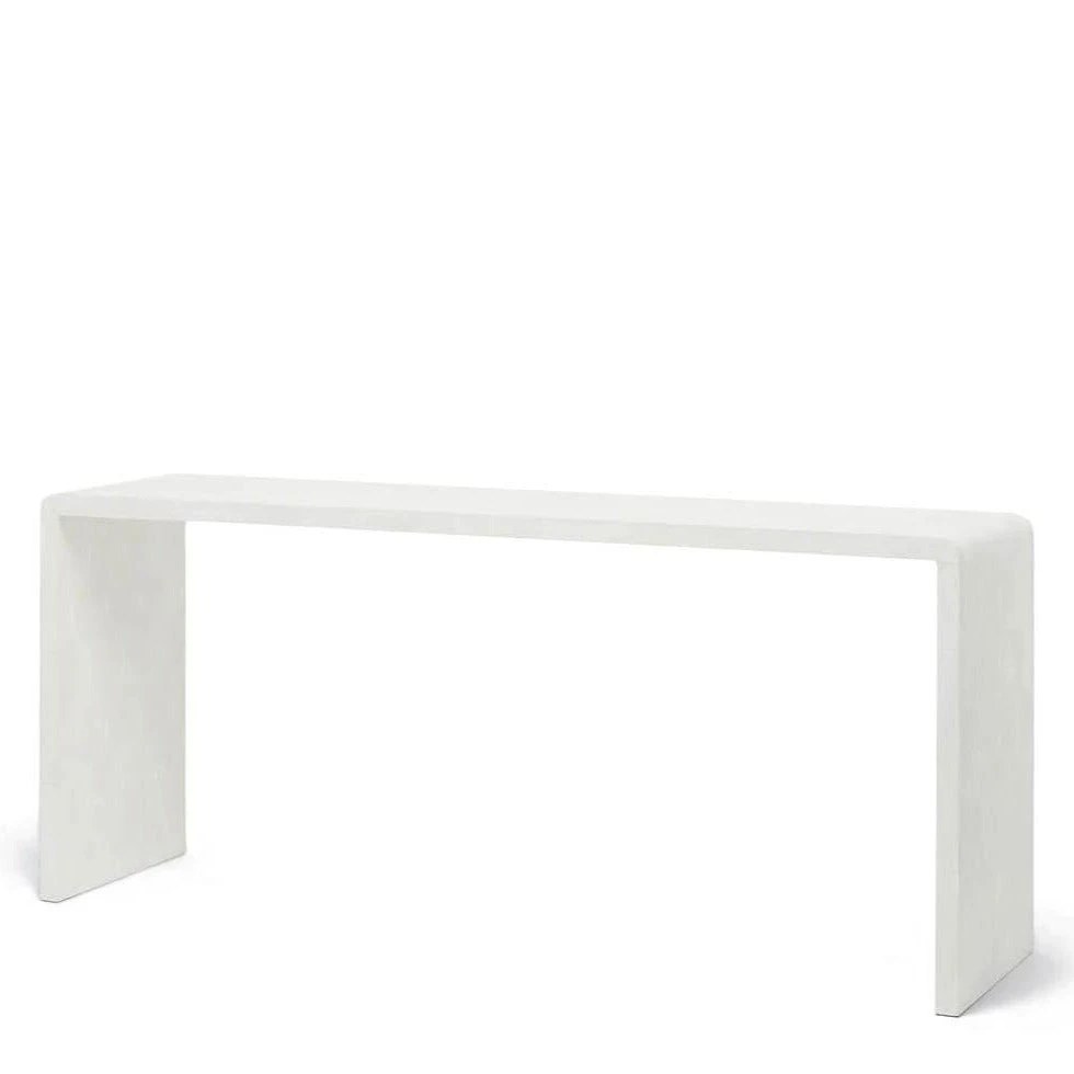 Made Goods Harlow 72″ Console in Blanc faux shagreen reflects a waterfall design, the ultimate in free floating console tables. Shaped in a rectangle design, a versatile console table like the Harlow can be used in the entryway, as a bar, or as a sofa table. *This item is handcrafted and may show slight variation in size from one piece to another.