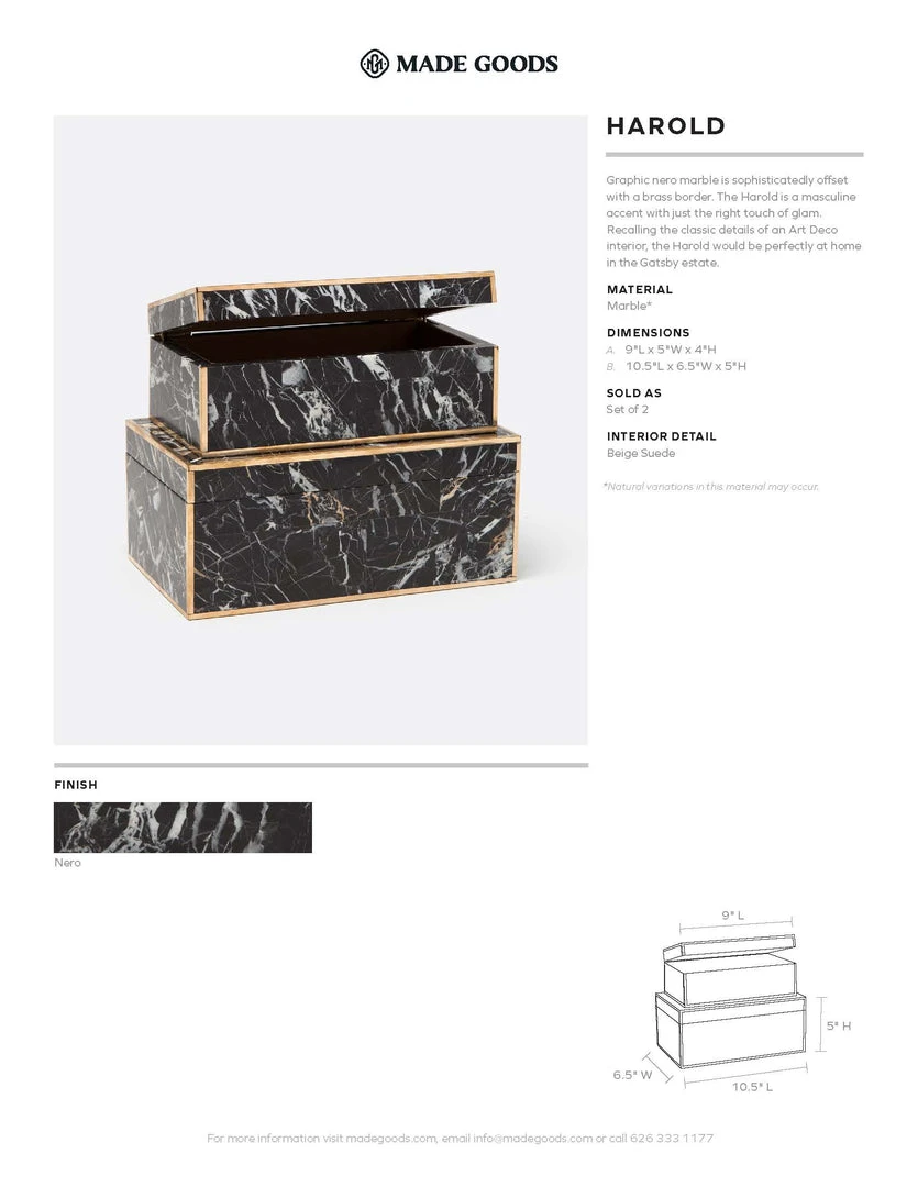 The Harold Box Set from Made Goods features a black and white marble finish giving each box a high-end vibe. Accented with a brass border, the Harold Boxes are a masculine accent with just the right touch of glam. Place the Nero boxes in the office on the desk and store the essentials. We love this set in the family room also holding remotes and electronic equipment. Place wherever you need an immediate touch of luxe. *Set of two.