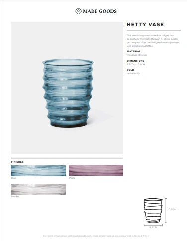 This semitransparent Hetty Vase in Smoke from Made Goods has ridges that beautifully filter light through it. The Hetty’s subtle yet unique color is designed to complement well-designed palettes. Perfect given as a gift or to add beauty and style to your own space