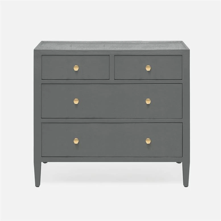 The Jarin 36″ Dresser from Made Goods showcases a functional size for smaller spaces in a Graphite Faux Belgian Linen finish. The three drawers offer the perfect amount of storage and gold-finished hardware adds stylish detailing. Dressers like the Jarin work beautifully in the guest bedroom or master suite and also work well as a stylish storage piece in the dining room or home office.