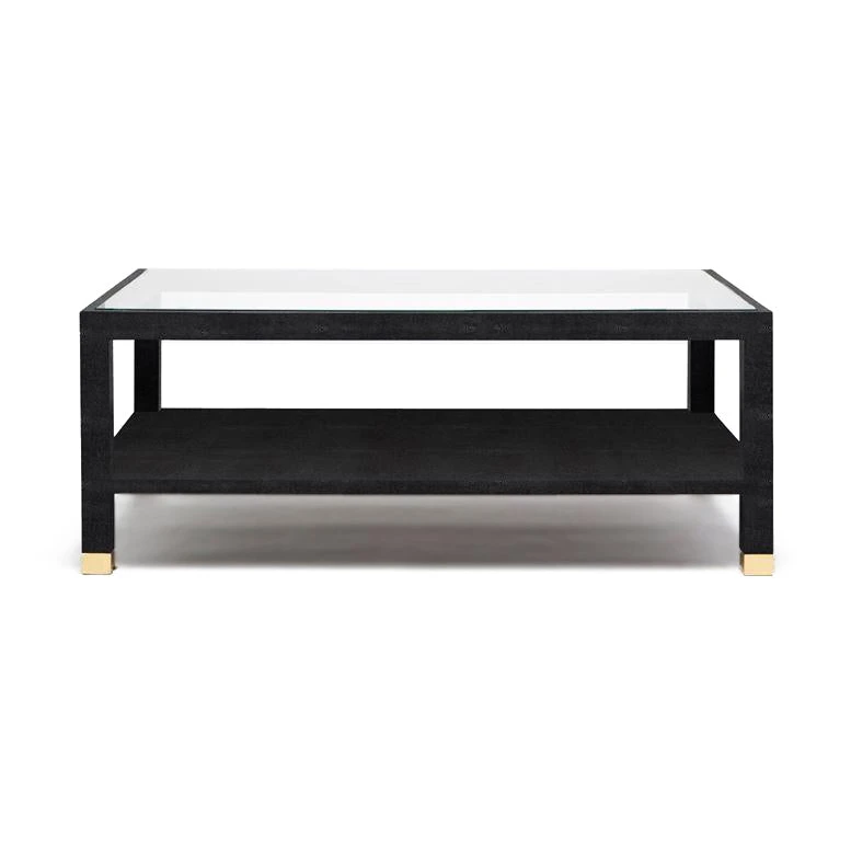 The Lafeu Rectangle Coffee Table in Black Faux Shagreen from Made Goods has a rectangle frame fully finished in a luxurious faux shagreen finish. A glass top reveals the piece’s lower shelf, and the table’s feet are capped in brass for a chic finishing detail.