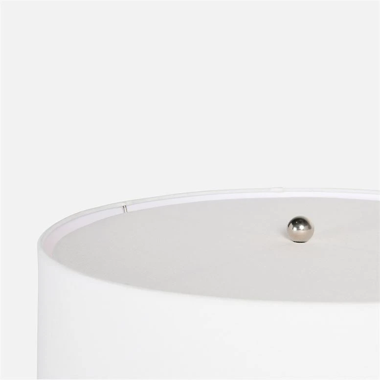 The Leigh Table Lamp from Made Goods features a round column covered in a unique and luxurious Micah stone with delicate variations of beige and white. Topped with a linen rectangle off white shade, the Leigh offers a high-end designer look for any room of your home.