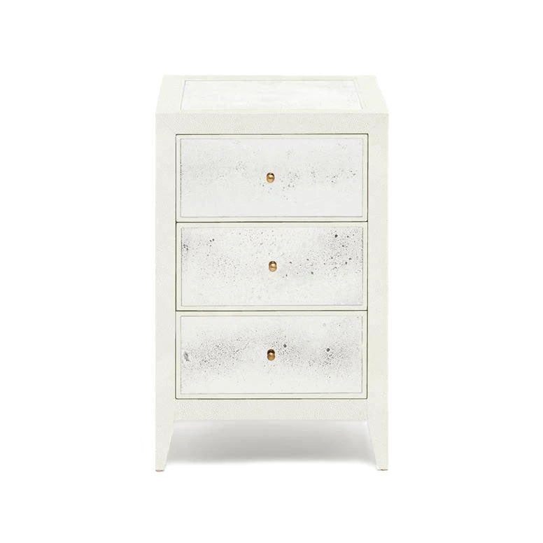 Made Goods Mia Single Nightstand in Pristine white Vintage Faux Shagreen captivates with chic design. This square bed side table reflects hand-applied antiqued mirror accents to bring light into your home and reflect your favorite colors. With elegant tapered legs, the modern contemporary Mia side table has three drawers with gold drawer pulls. Consider the storage options bed side tables like the Mia offer. Place this small chest next to a bed, settee or chair to provide a quick easy access to electronics, coasters, reading glasses or writing pens and pads.