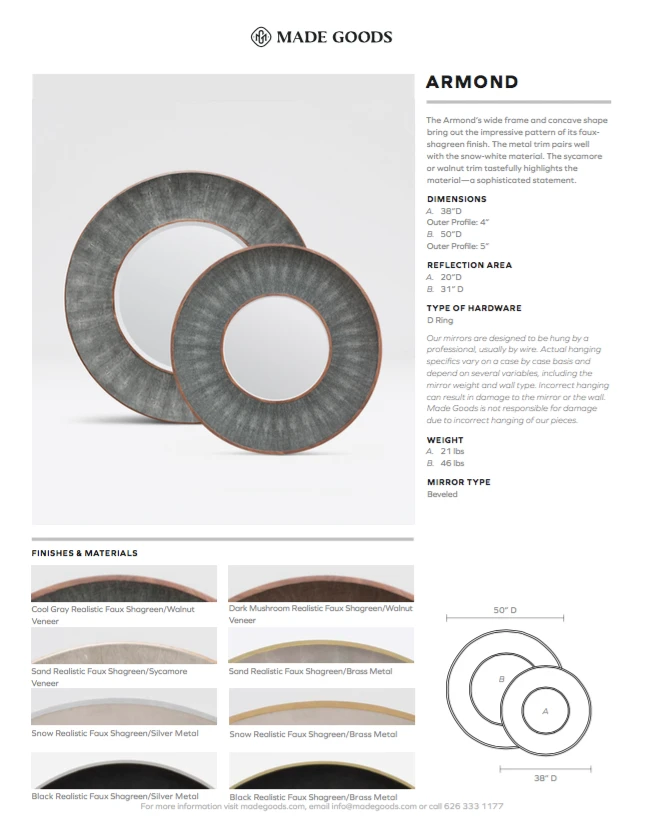 Made Goods presents the unique Armond Small Mirror in Black and Gold Shagreen. The Armond features a substantial frame and concave round shape. Wall mirrors like the Armond give you endless options for a variety of wall spaces in your home. The smaller Armond can be used as a bathroom mirror in your powder room or as vanity mirrors in your master en suite.